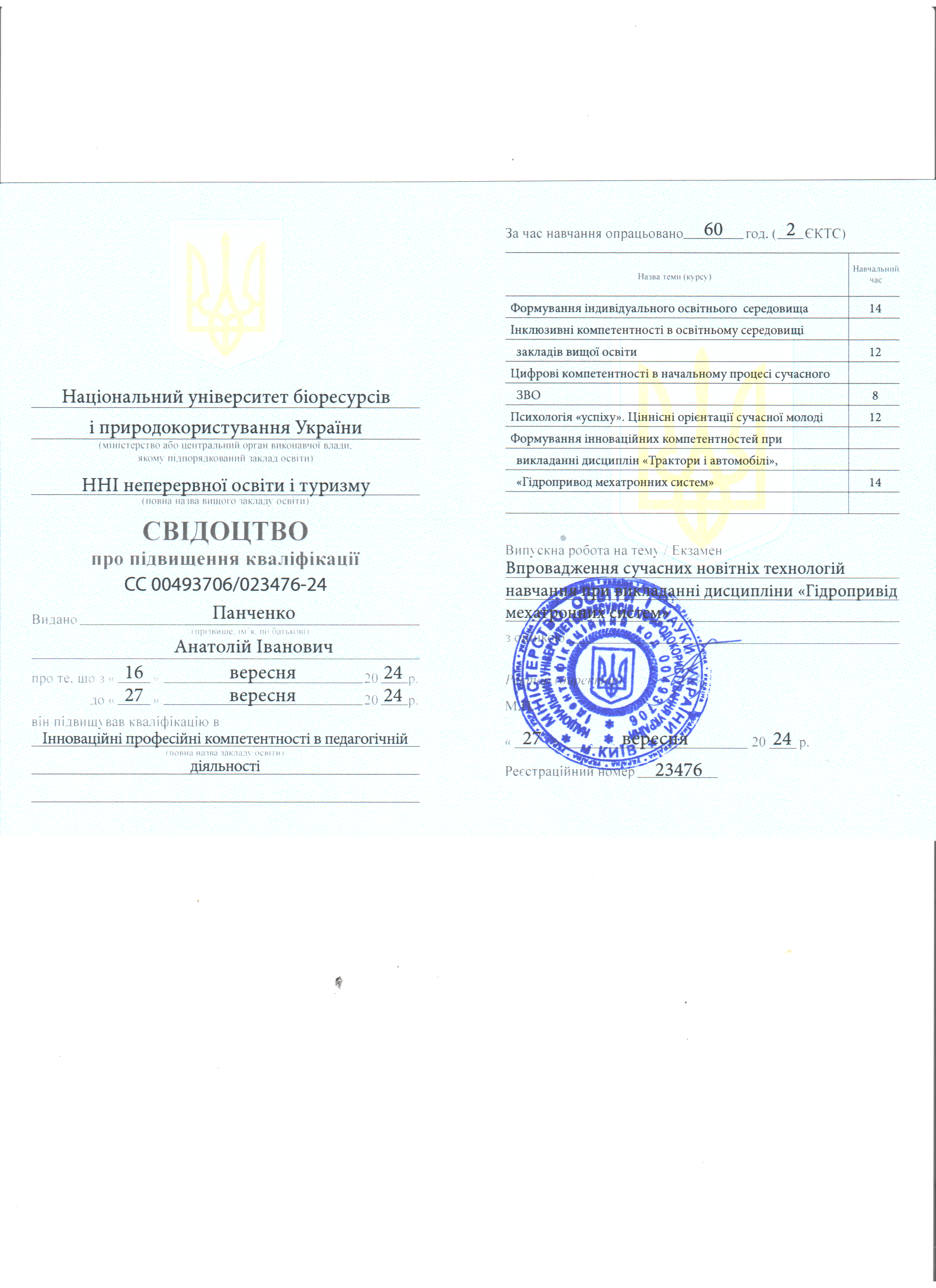 Національний університет біоресурсів і природокористування України, ННІ неперервної освіти і туризму (м.Київ, Україна). Свідоцтво про підвищення кваліфікації СС 00493706/023476-24 №23476 від 27.09.2024 р. Тема: «Інноваційні професійні компетентності в педагогічній діяльності», обсягом 60 годин (2 кредити ЄКТС).