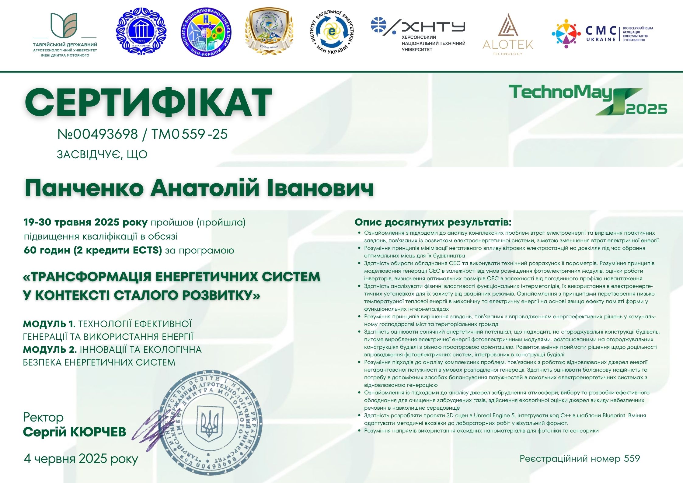 ТДАТУ (м. Запоріжжя, Україна), Інститут загальної енергетики НАН України (м. Київ, Україна), Інститут відновлюваної енергетики НАН України (м. Київ, Україна), ХНУМГ (м. Харків, Україна), ДБТУ (м. Харків, Україна), ХНТУ (м. Хмельницький , Україна) , ALOTEK (Польща), Всеукраїнська асоціація консультантів з управління CMC-Ukraine (м. Київ, Україна). Сертифікат №00493698 / ТМ0 559-25 від 04.06.2025 р. Тема: “Трансформація енергетичних систем у контексті сталого розвитку”, обсягом 60 годин (2 кредити ЄКТС).