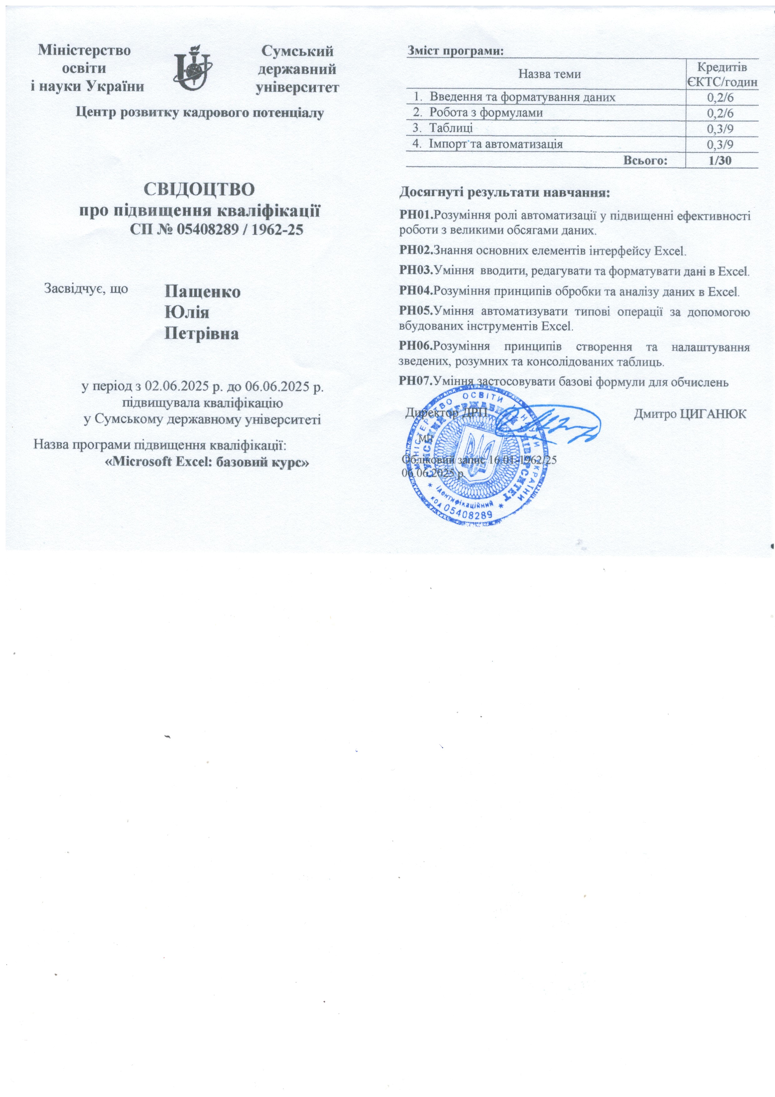 Сумський державний університет (м. Суми, Україна). Свідоцтво про підвищення кваліфікації СП №05408289/1962-25 від 06.06.2025 р. Тема: “Microsoft Excel: базовий курс”, обсягом 30 годин (1 кредит ЄКТС).