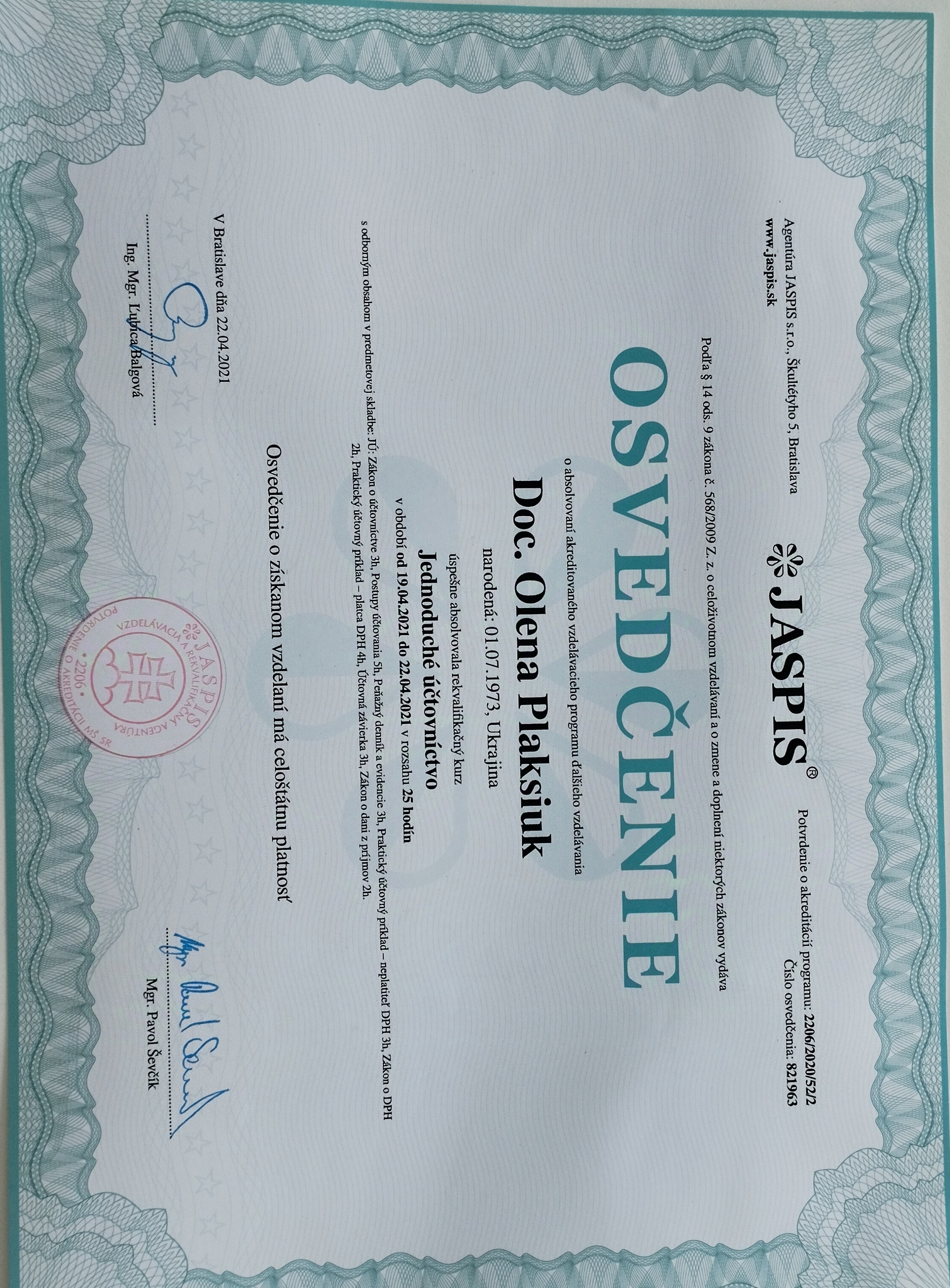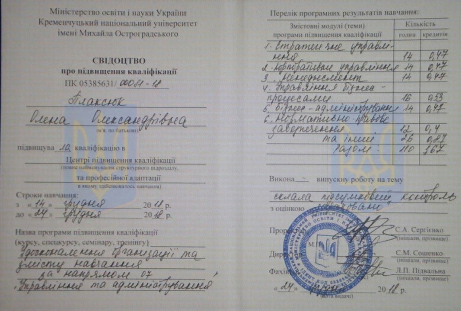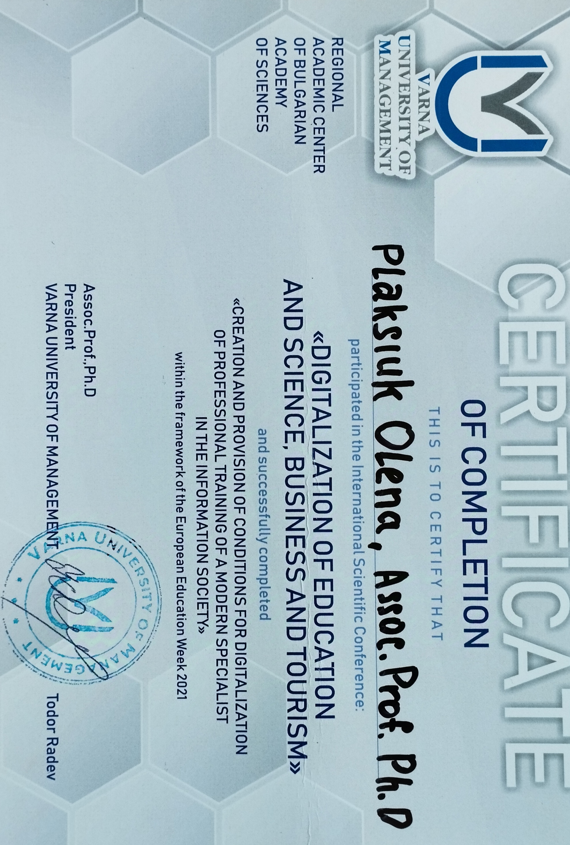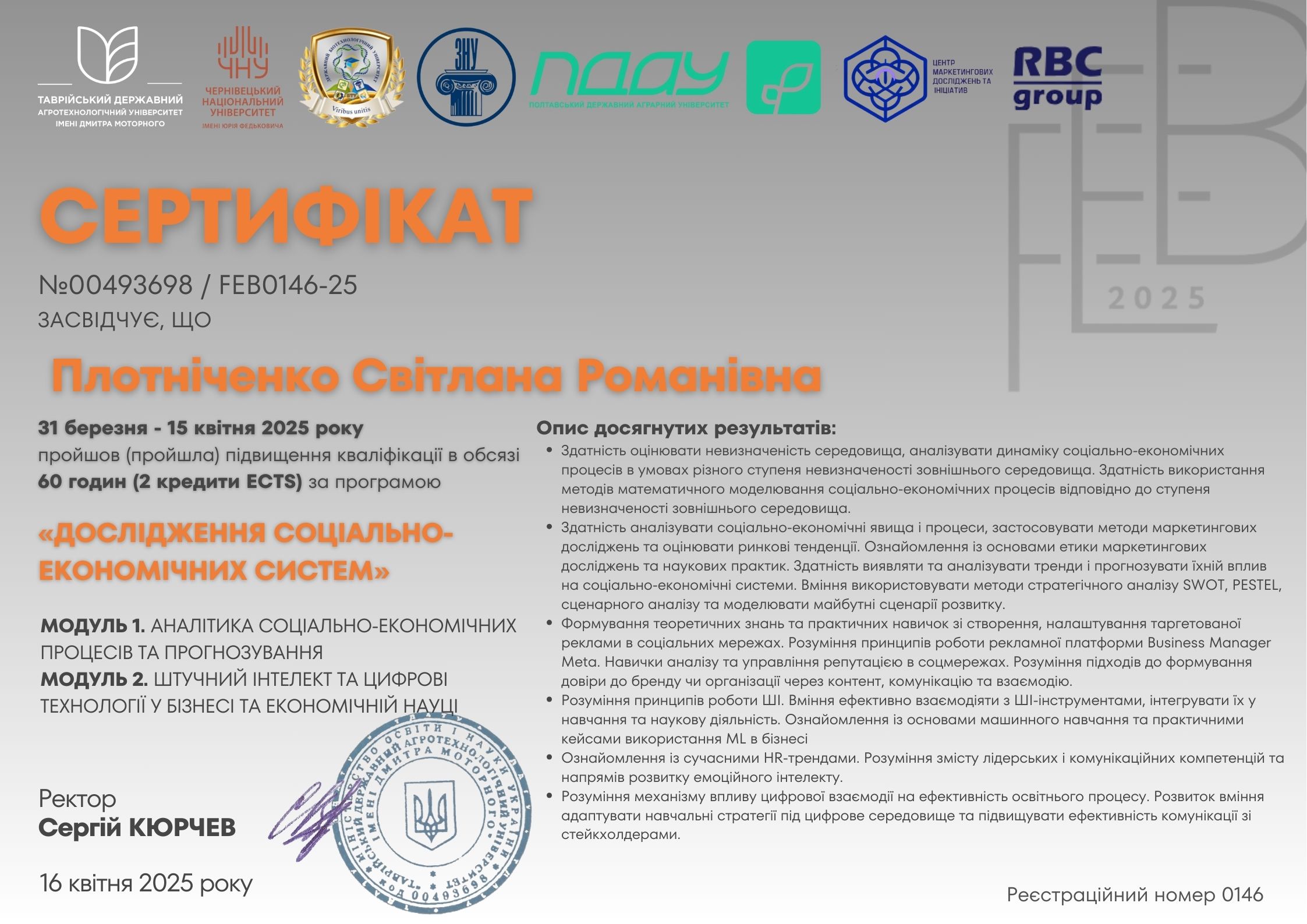 ТОВ «М.Е.Док» (м. Київ, Україна). Сертифікат про проходження курсу №ТДА/В011 від 28.10.2024 р. Тема: «M.E.Doc», обсягом 30 годин (1 кредит ЄКТС). Визнано підвищенням кваліфікації (наказ ректора ТДАТУ №79-ІПК від 07.04.2025 р.)