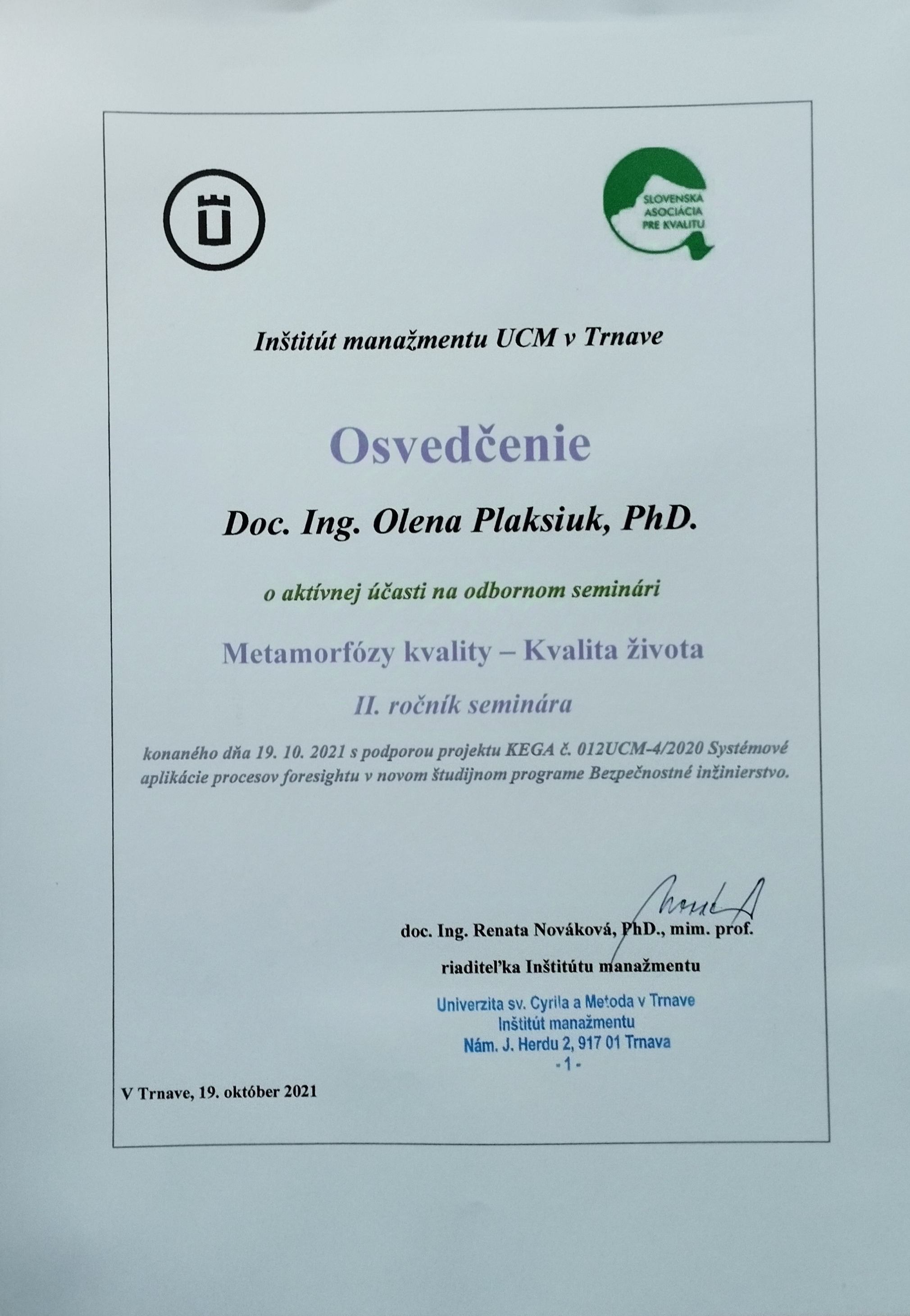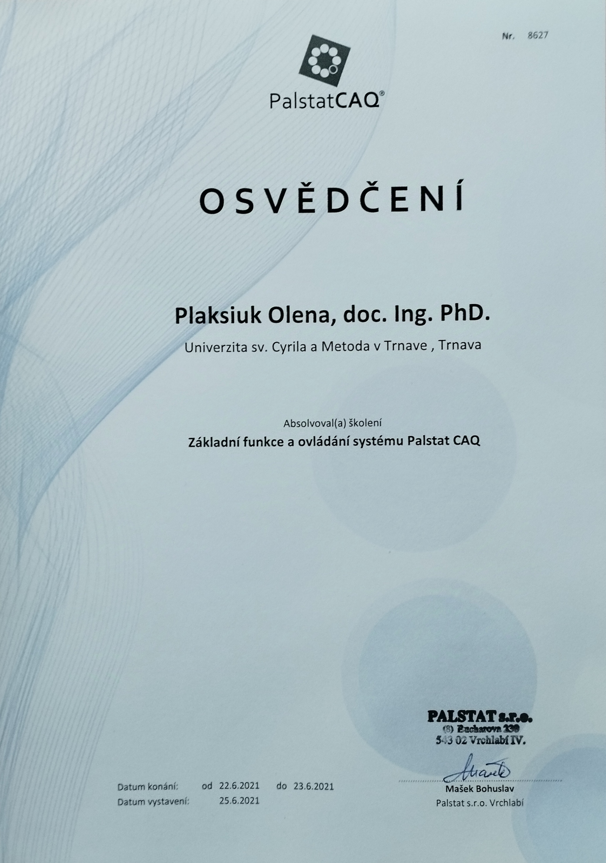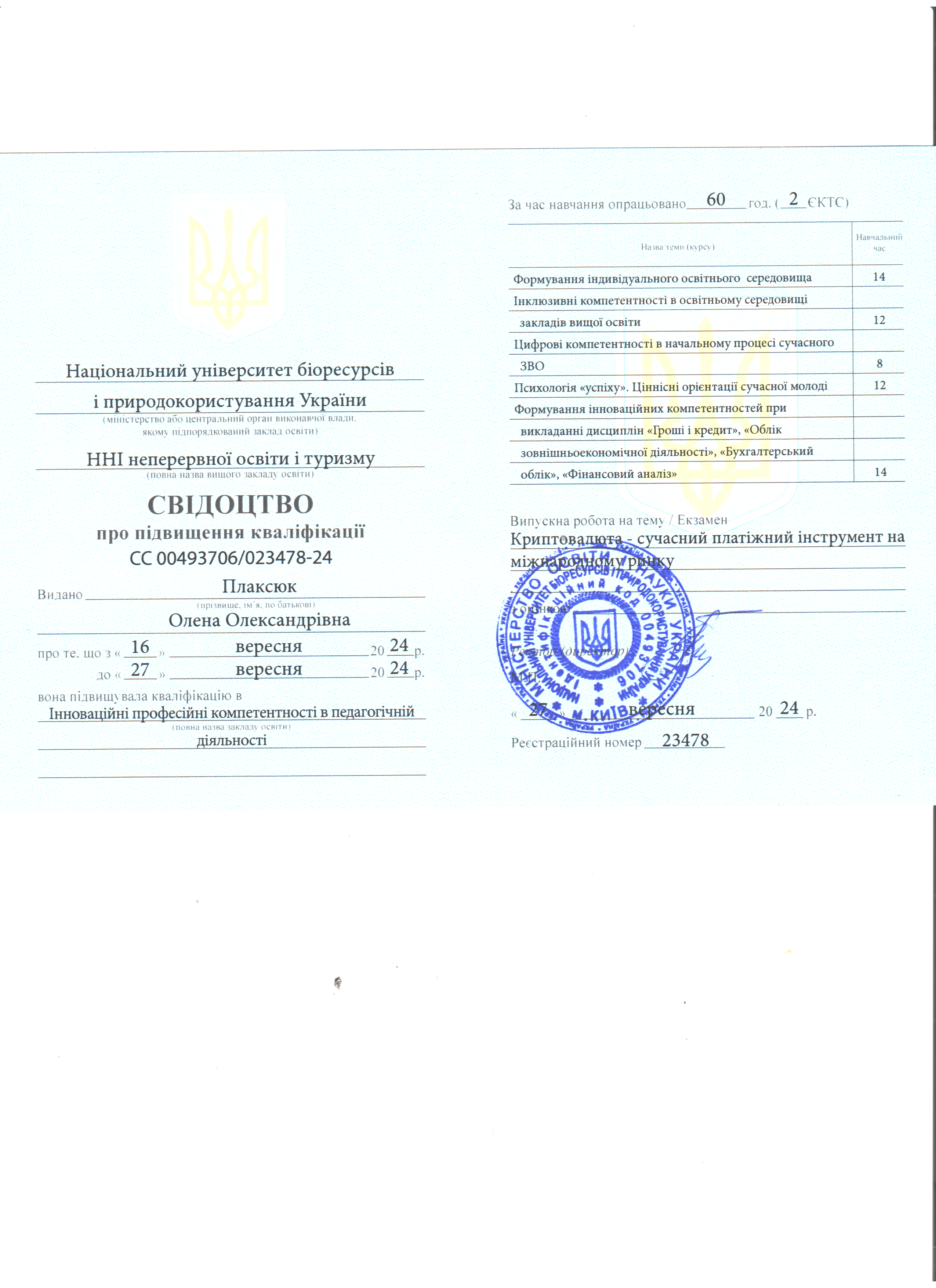 ТОВ «М.Е.Док» (м. Київ, Україна). Сертифікат про проходження курсу №ТДА/В011 від 28.10.2024 р. Тема: «M.E.Doc», обсягом 30 годин (1 кредит ЄКТС). Визнано підвищенням кваліфікації (наказ ректора ТДАТУ №79-ІПК від 07.04.2025 р.)