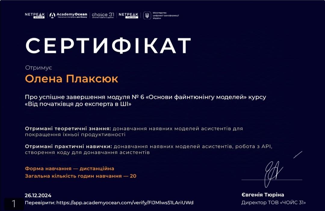ТОВ «ЧОЙС 31» (м. Одеса, Україна). Сертифікат про завершення курсу, виданий 26.12.2024 р. Тема: «Основи файнтюнінгу моделей», обсягом 20 годин (0,7 кредиту ЄКТС). Визнано підвищенням кваліфікації (наказ ректора ТДАТУ №79-ІПК від 07.04.2025 р.)