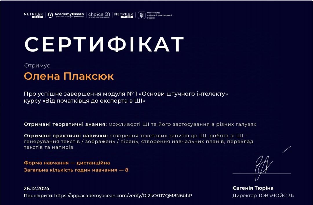 ТОВ «ЧОЙС 31» (м. Одеса, Україна). Сертифікат про завершення курсу, виданий 26.12.2024 р. Тема: «Основи штучного інтелекту», обсягом 8 годин (0,3 кредиту ЄКТС). Визнано підвищенням кваліфікації (наказ ректора ТДАТУ №79-ІПК від 07.04.2025 р.)