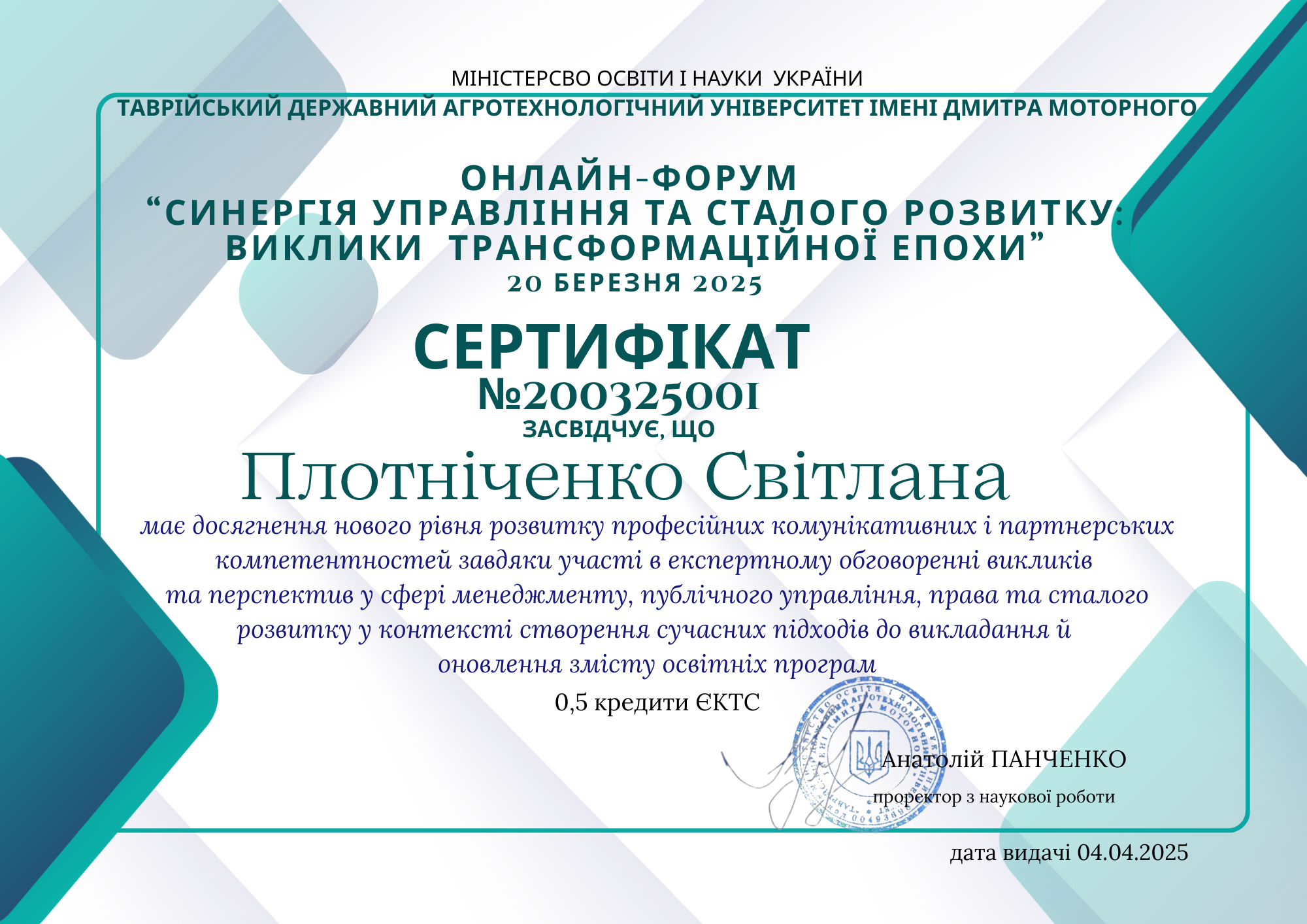 ГО «Агенція сталого розвитку та освітніх ініціатив» (м. Київ, Україна). Сертифікат про участь в онлайн-форумі № ПК-К-24-11/219 від 19.11.2024 р. Тема: «Фінансова грамотність та сталий розвиток» (платформа 4PEOPLE), обсягом 6 годин (0,2 кредиту ЄКТС).Визнано підвищенням кваліфікації (наказ ректора ТДАТУ №79-ІПК від 07.04.2025 р.)