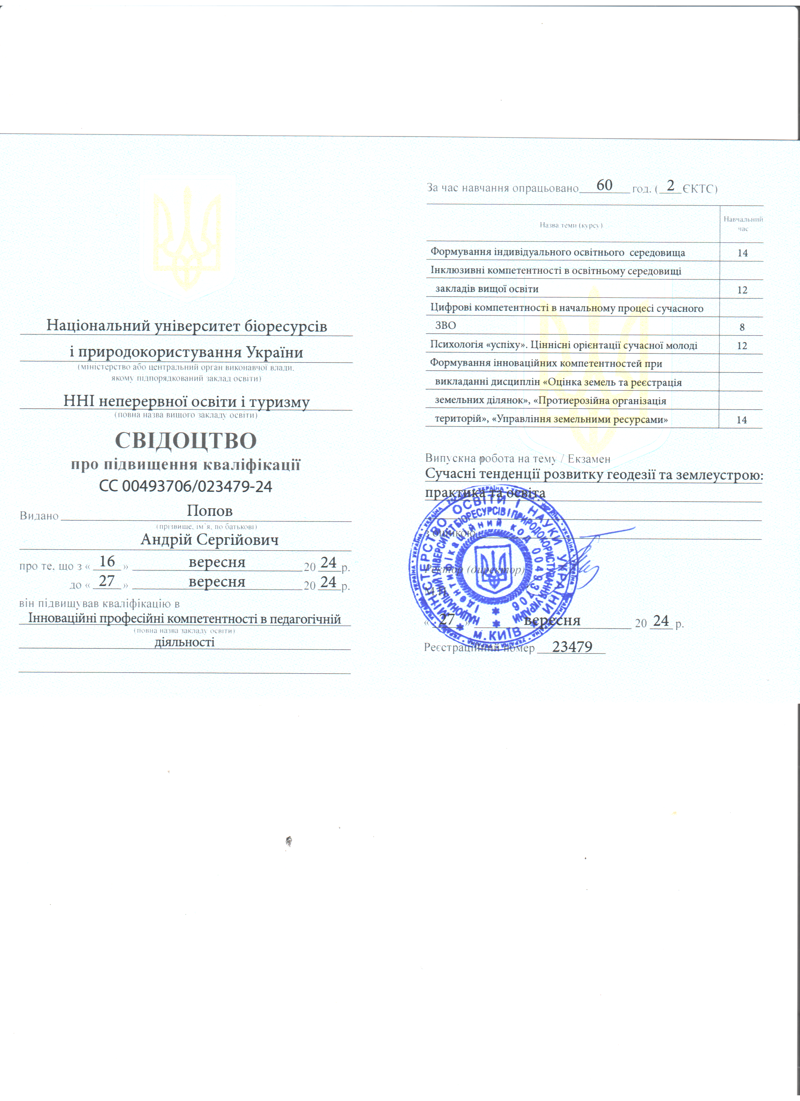 Національний університет біоресурсів і природокористування України, ННІ неперервної освіти і туризму (м.Київ, Україна). Свідоцтво про підвищення кваліфікації СС 00493706/023479-24 №23479 від 27.09.2024 р. Тема: «Інноваційні професійні компетентності в педагогічній діяльності», обсягом 60 годин (2 кредити ЄКТС).