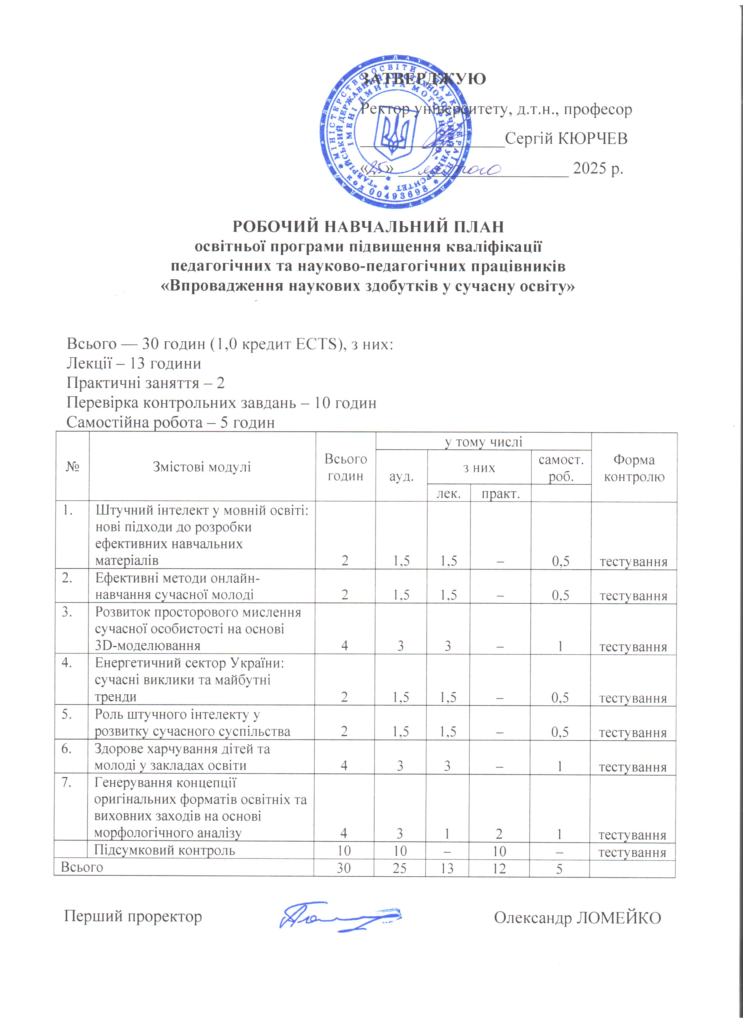 Програма підвищення кваліфікації у дистанційному форматі для педагогічних, науково-педагогічних працівників закладів для підвищення кваліфікації педагогічних та науково-педагогічних працівників закладів загальної середньої та вищої освіти на тему “Впровадження наукових здобутків у сучасну освіту”. Учасники отримують сертифікат про підвищення кваліфікації обсягом 30 годин (1 кредит ЄКТС).