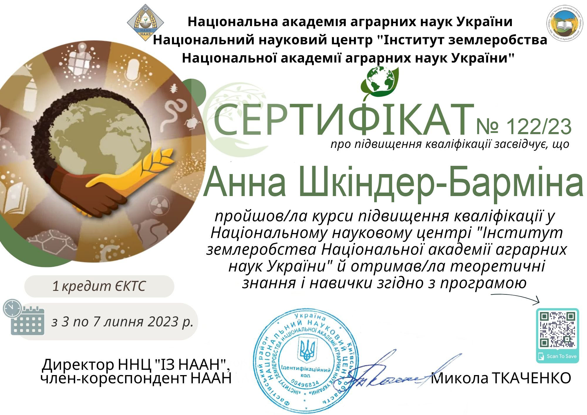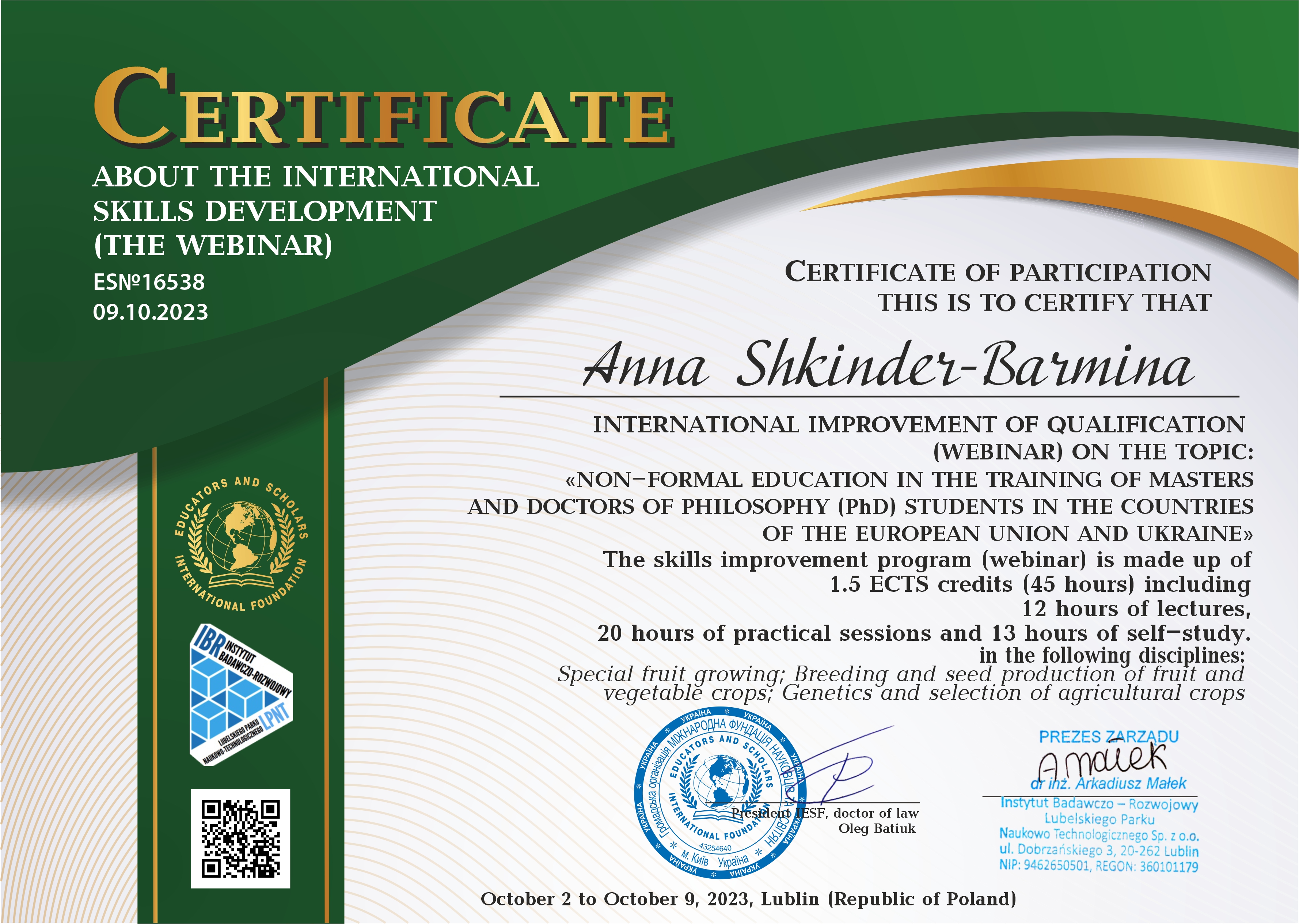 ГО “МФНО” (IESF), Instytut Badawczo-Rozwojowy Lubelskiego Parku Naukowo-Technologicznego (м. Люблін, Республіка Польща). Сертифікат про участь у вебінарі ES № 16538 від 09.10.2023 р. Тема: “Неформальна освіта в підготовці магістрів та здобувачів доктора філософії (PhD) в країнах Європейського союзу та України”, обсягом 45 годин (1,5 кредиту ЄКТС). Визнано підвищенням кваліфікації (наказ №449-ІПК від 28.12.2023 р.)