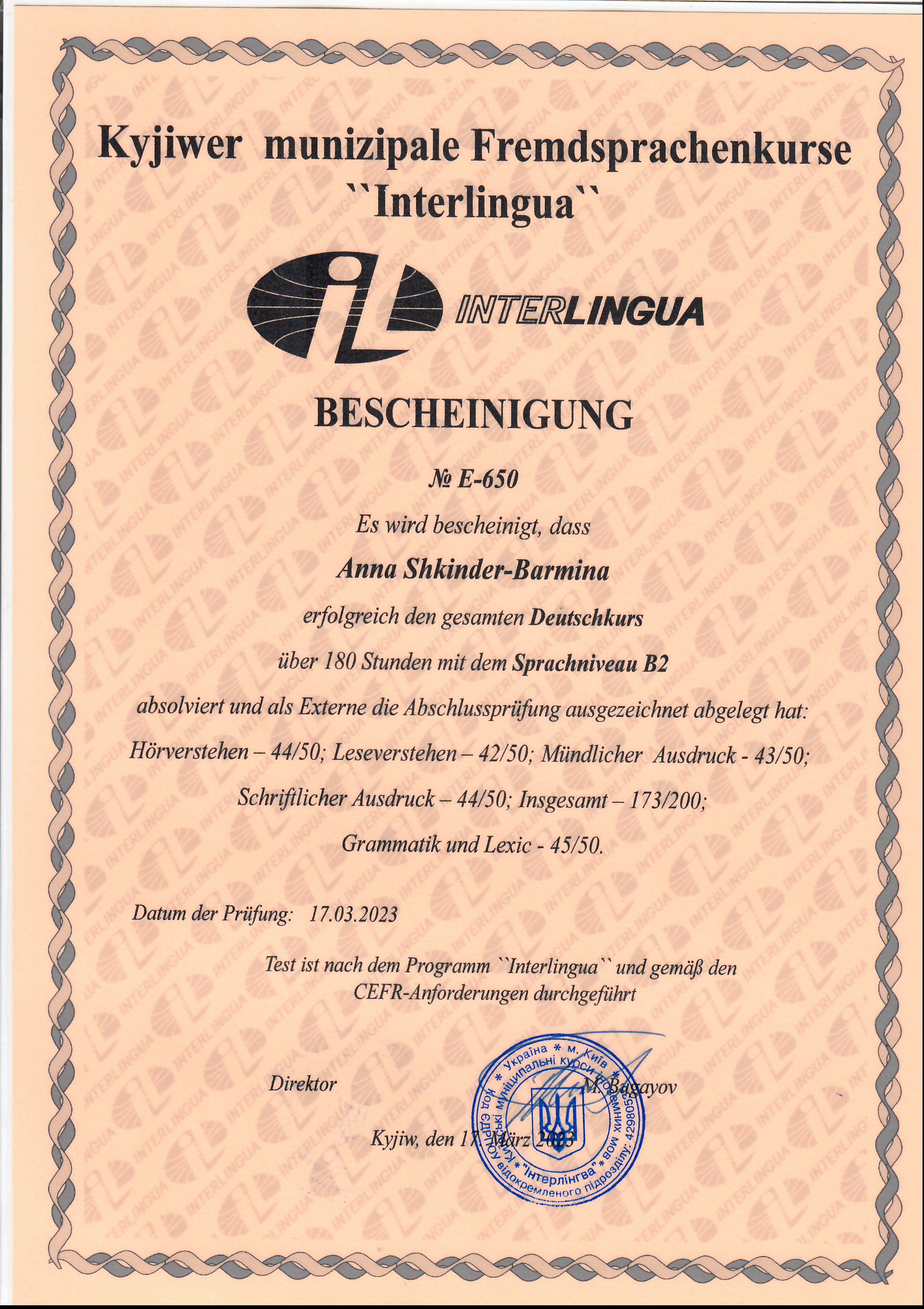 Київські муніципальні курси іноземних мов «Інтерлінгва» (м. Київ, Україна). Сертифікат про проходження мовного курсу № E-650 від 17.03.2023 р. Тема: “Німецька мова рівень В2”, обсягом 180 годин (6 кредитів ЄКТС). Визнано підвищенням кваліфікації (наказ №449-ІПК від 28.12.2023 р.)