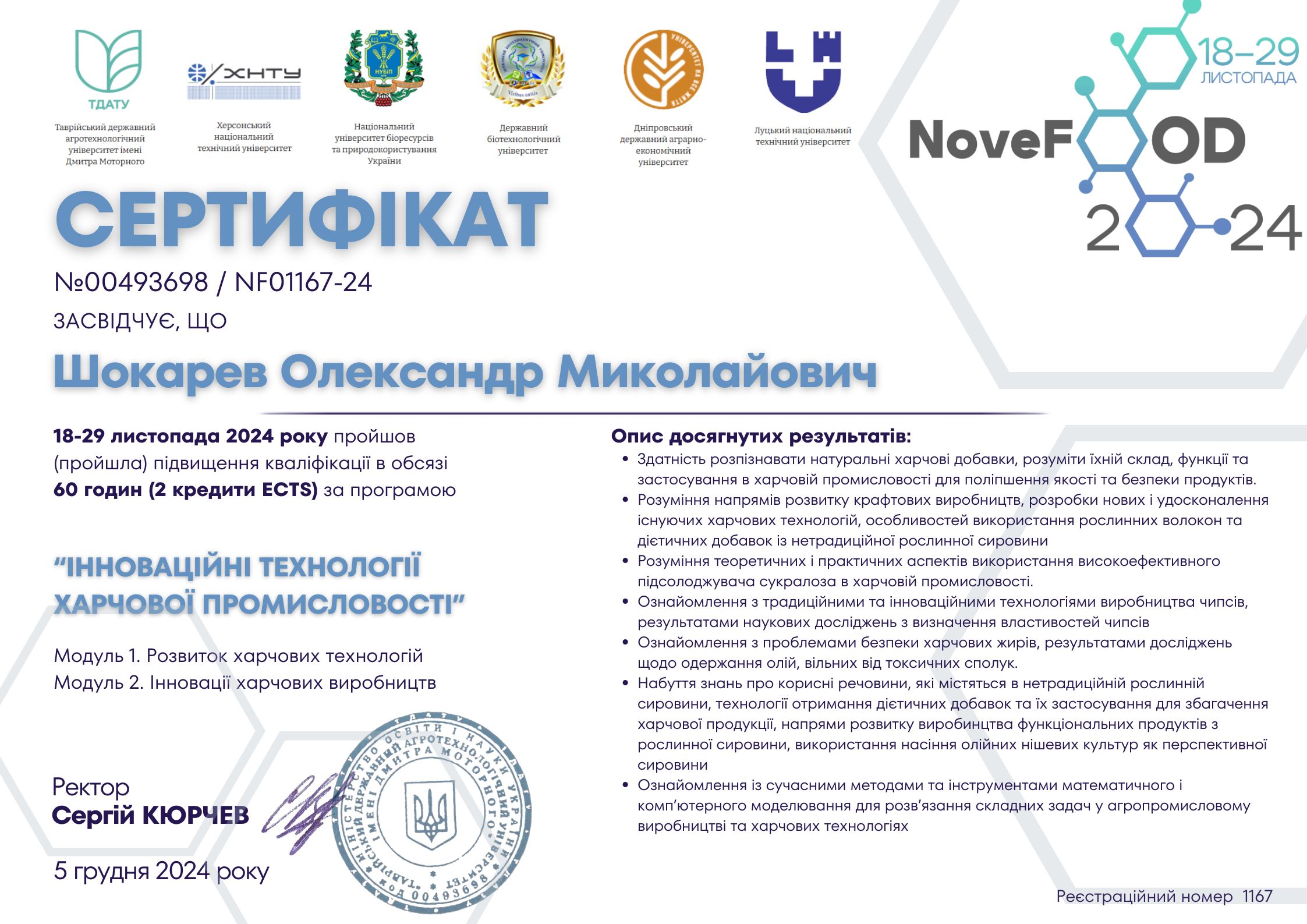 Таврійський державний агротехнологічний університет імені Дмитра Моторного (м.Запоріжжя, Україна), ХНТУ (м.Херсон, Україна), НУБіП (м.Київ, Україна), Державний біотехнологічний університет (м.Харків, Україна), Дніпровський державний аграрно-економічний університет (м.Дніпро, Україна), ЛНТУ (м.Луцьк, Україна). Сертифікат про підвищення кваліфікації №00493698/NF01167-24 від 05.12.2024 р. Тема: «Інноваційні технології харчової промисловості», обсягом 60 годин (2 кредити ЄКТС).