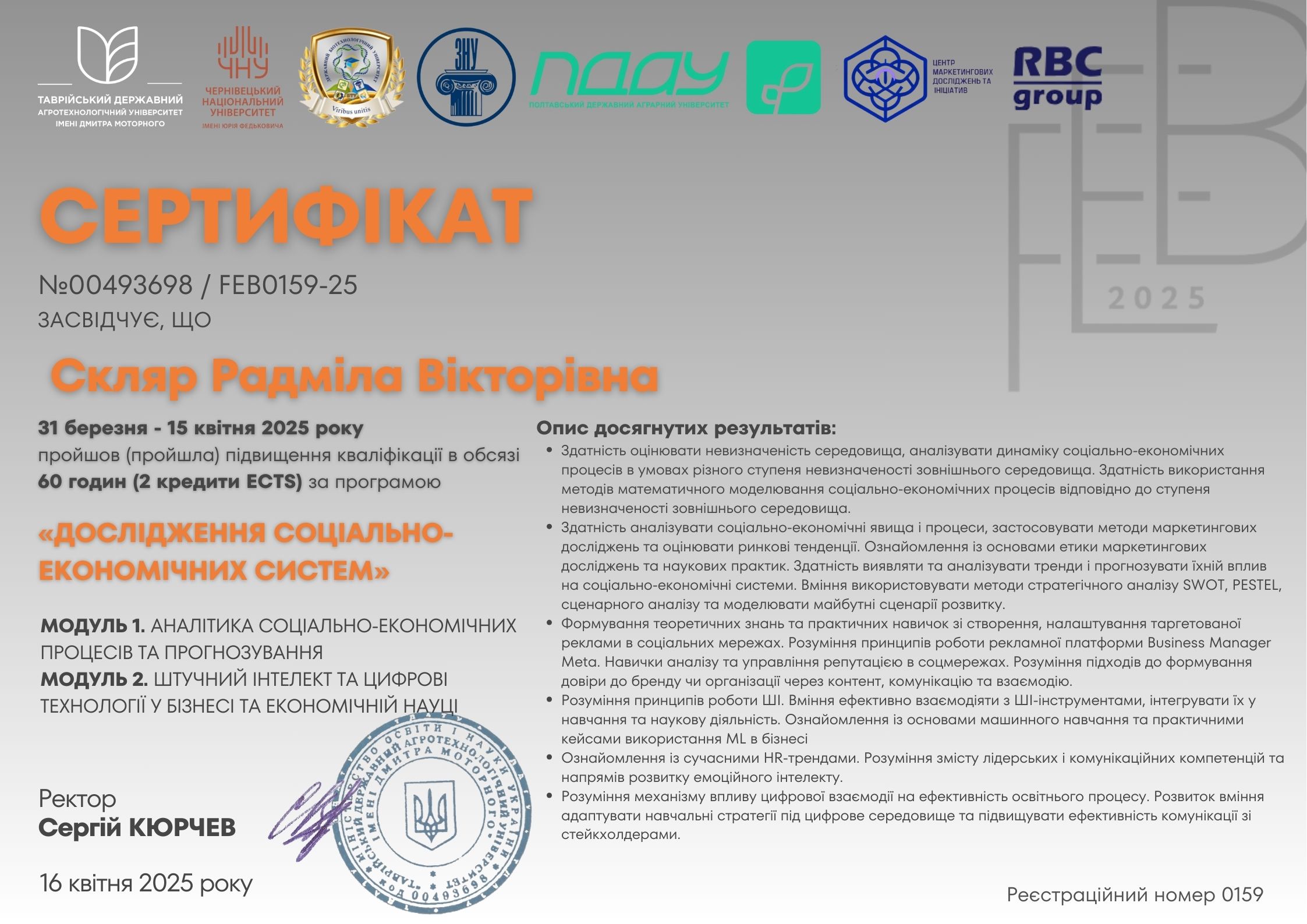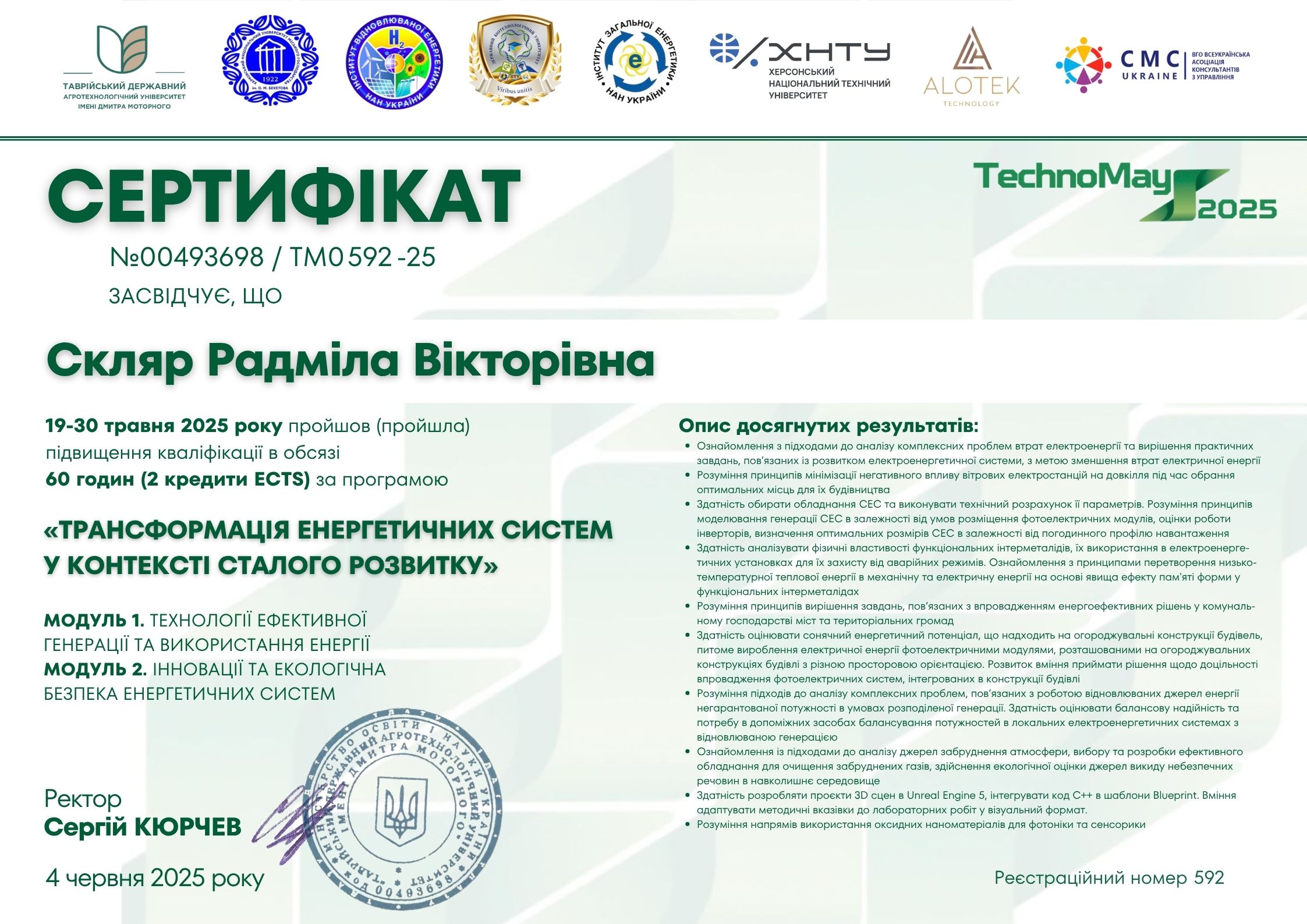 ГО “Прогресильні”, WINWIN AI Center of Excellence при Мінцифри. Сертифікат про підвищення кваліфікації №ВКШІО-3574 від 23.06.2025 р. Тема: “Великий курс про ШІ в освіті”, обсягом 45 годин (1,5 кредиту ЄКТС). Визнано підвищенням кваліфікації (наказ ректора ТДАТУ №355-ІПК від 06.10.2025 р.)