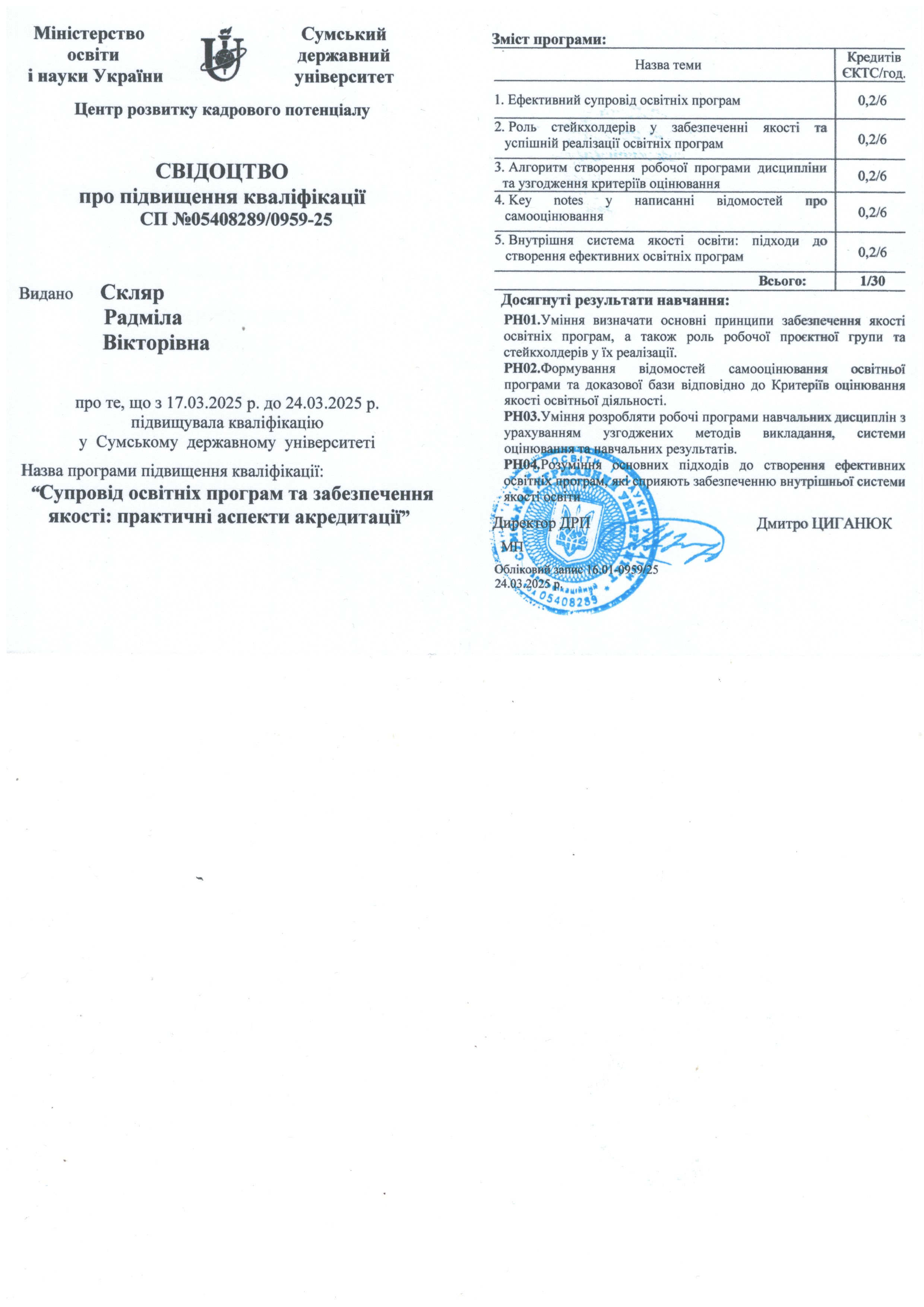 Aalto University, EIT Health, Erasmus Centre for Entrepreneurship, Міністерство освіти і науки України. Сертифікат про завершення тренінгової програми, виданий 03.04.2025 р. Тема: “Science2Business” (за фінансової підтримки ЄС через Європейську інноваційну раду), обсягом 50 годин (1,6 кредиту ЄКТС). Визнано підвищенням кваліфікації (наказ ректора ТДАТУ №108-ІПК від 30.04.2025 р.)