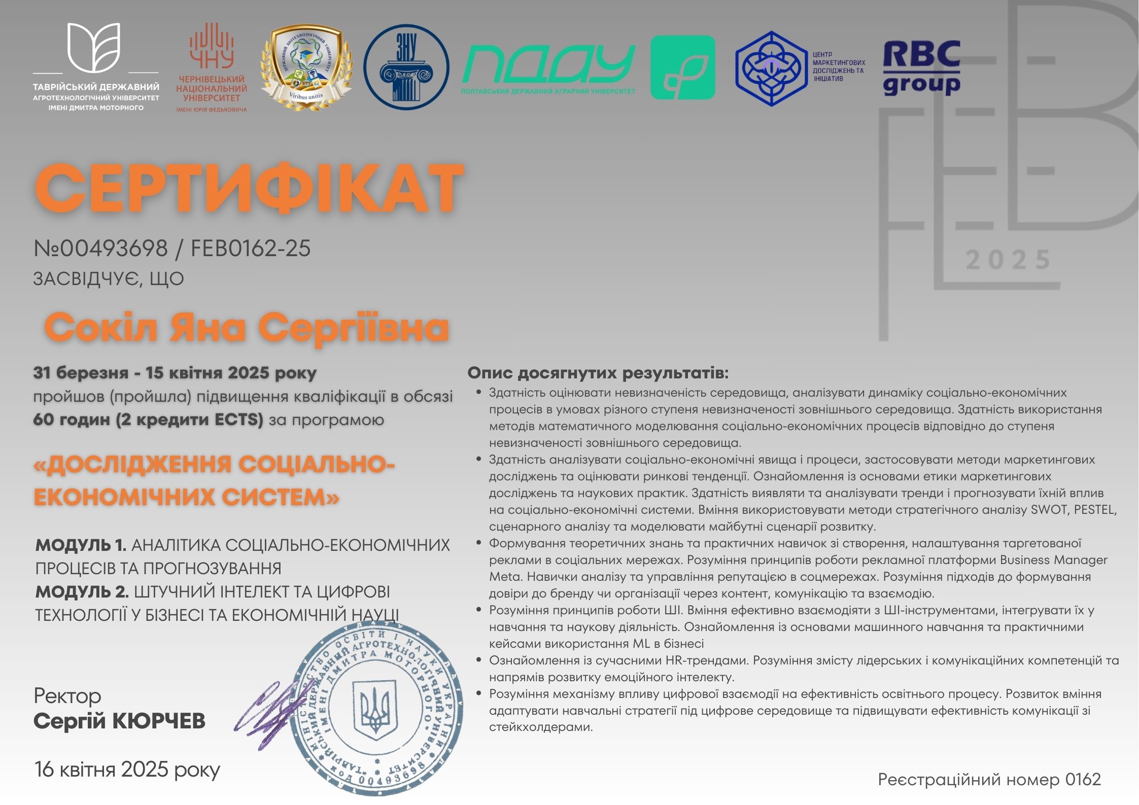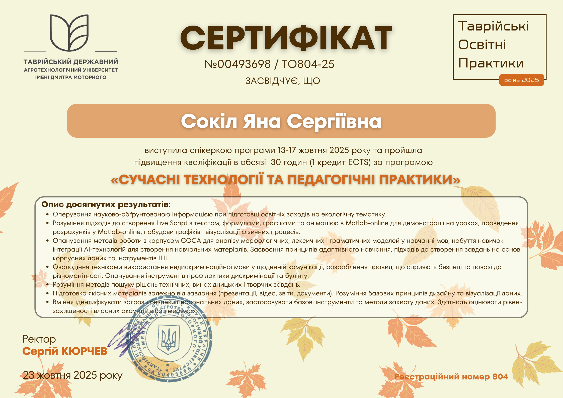 Scientific Center of Innovative Research (SCIR) (Püssi, Естонія). Сертифікат про проходження тренінгу №SCIR-2024-0199 від 15.12.2024 р. Тема: «Штучний інтелект у науковому та освітньому маркетингу», обсягом 180 годин (6 кредитів ЄКТС).Визнано підвищенням кваліфікації (наказ ректора ТДАТУ №79-ІПК від 07.04.2025 р.)