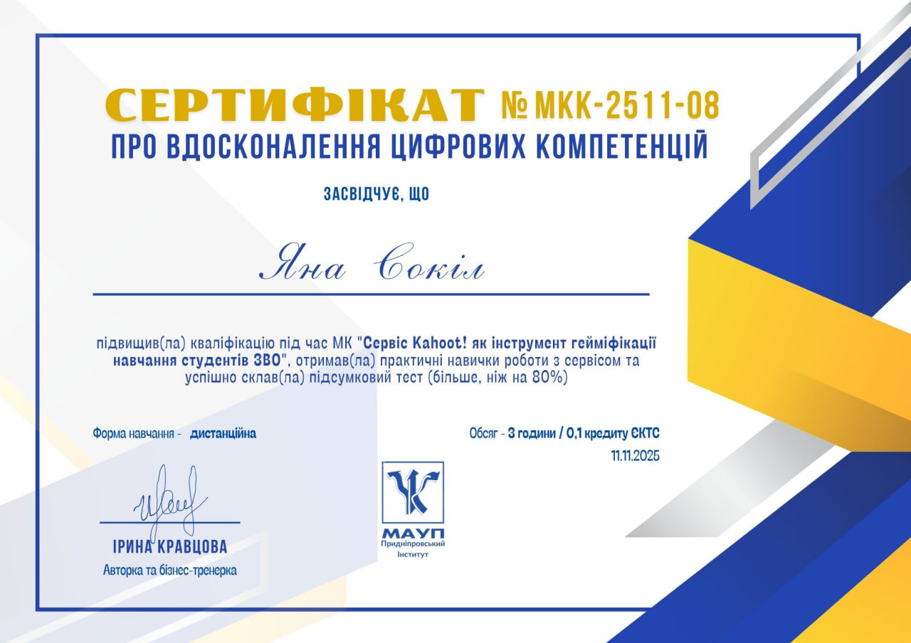 Вища школа управління охороною праці у Катовіцах (WSZOP) (Katowice, Польща). Сертифікат про участь у вебінарі, виданий 12.12.2024 р. Тема: «Сучасні технології і їх вплив у комунікації», обсягом 3 години (0,1 кредиту ЄКТС).Визнано підвищенням кваліфікації (наказ ректора № 243-ІПК від 30.06.2025 р.)
