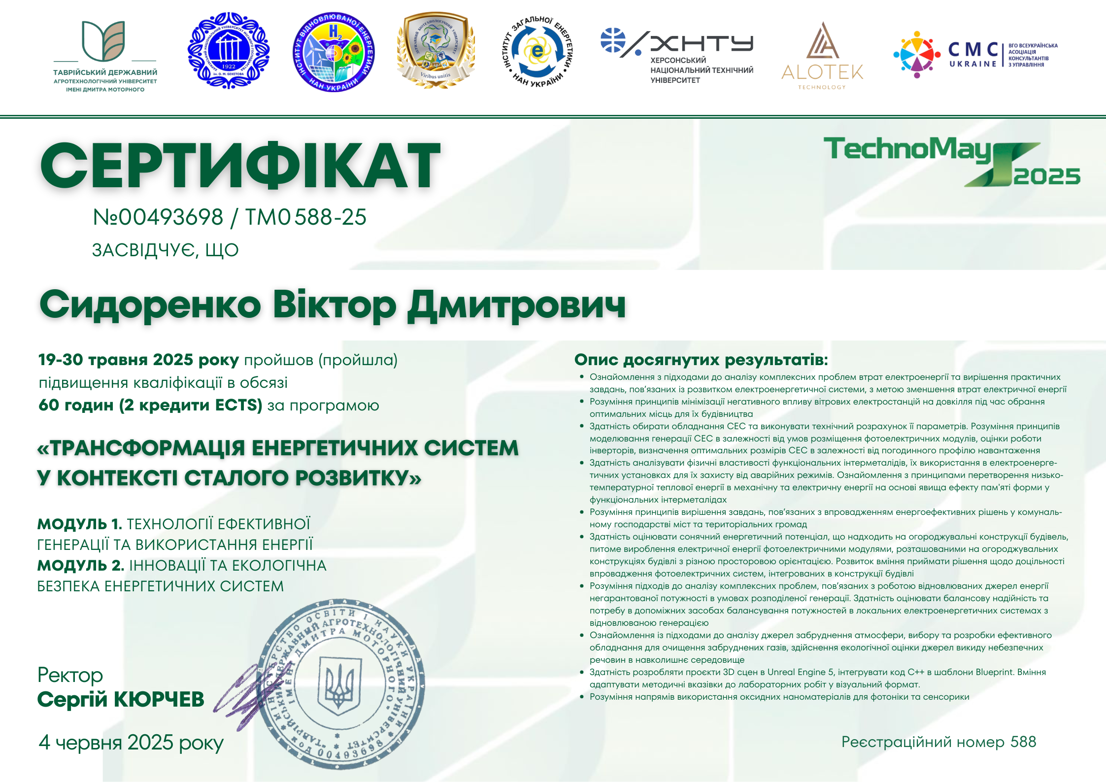 ТДАТУ (м. Запоріжжя, Україна), Інститут загальної енергетики НАН України (м. Київ, Україна), Інститут відновлюваної енергетики НАН України (м. Київ, Україна), ХНУМГ (м. Харків, Україна), ДБТУ (м. Харків, Україна), ХНТУ (м. Хмельницький , Україна), ALOTEK (Польща), Всеукраїнська асоціація консультантів з управління CMC-Ukraine (м. Київ, Україна). Сертифікат №00493698 / ТМ0 588-25 від 04.06.2025 р. Тема: “Трансформація енергетичних систем у контексті сталого розвитку”, обсягом 60 годин (2 кредити ЄКТС).