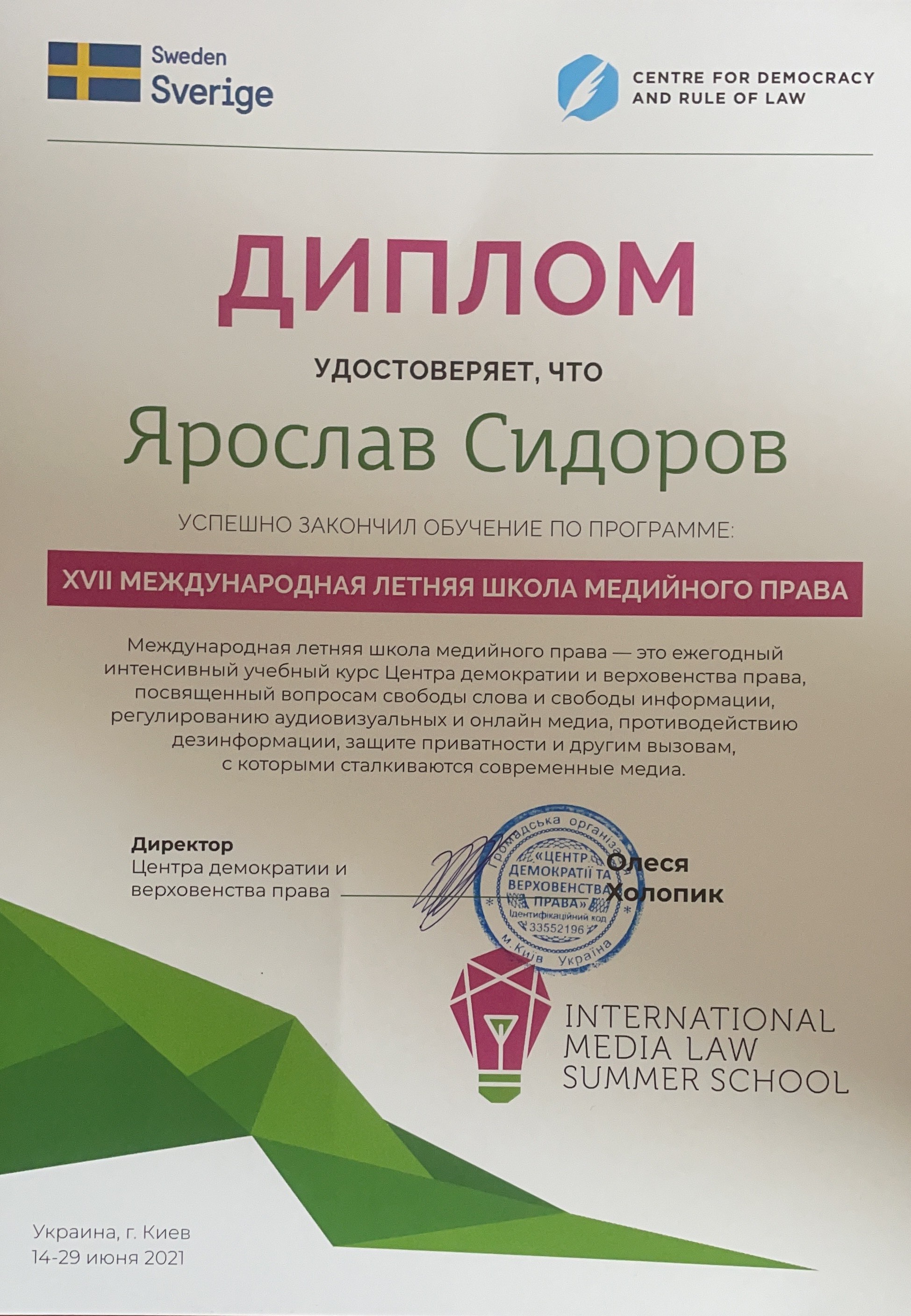 ГО “Центр демократії та верховенства права” (м. Київ, Україна). Диплом про завершення навчання, виданий в червні 2021 р. Тема: “XVIІ Міжнародна літня школа медійного права” (за фінансової підтримки Швеції), обсягом 2 кредити ЄКТС.