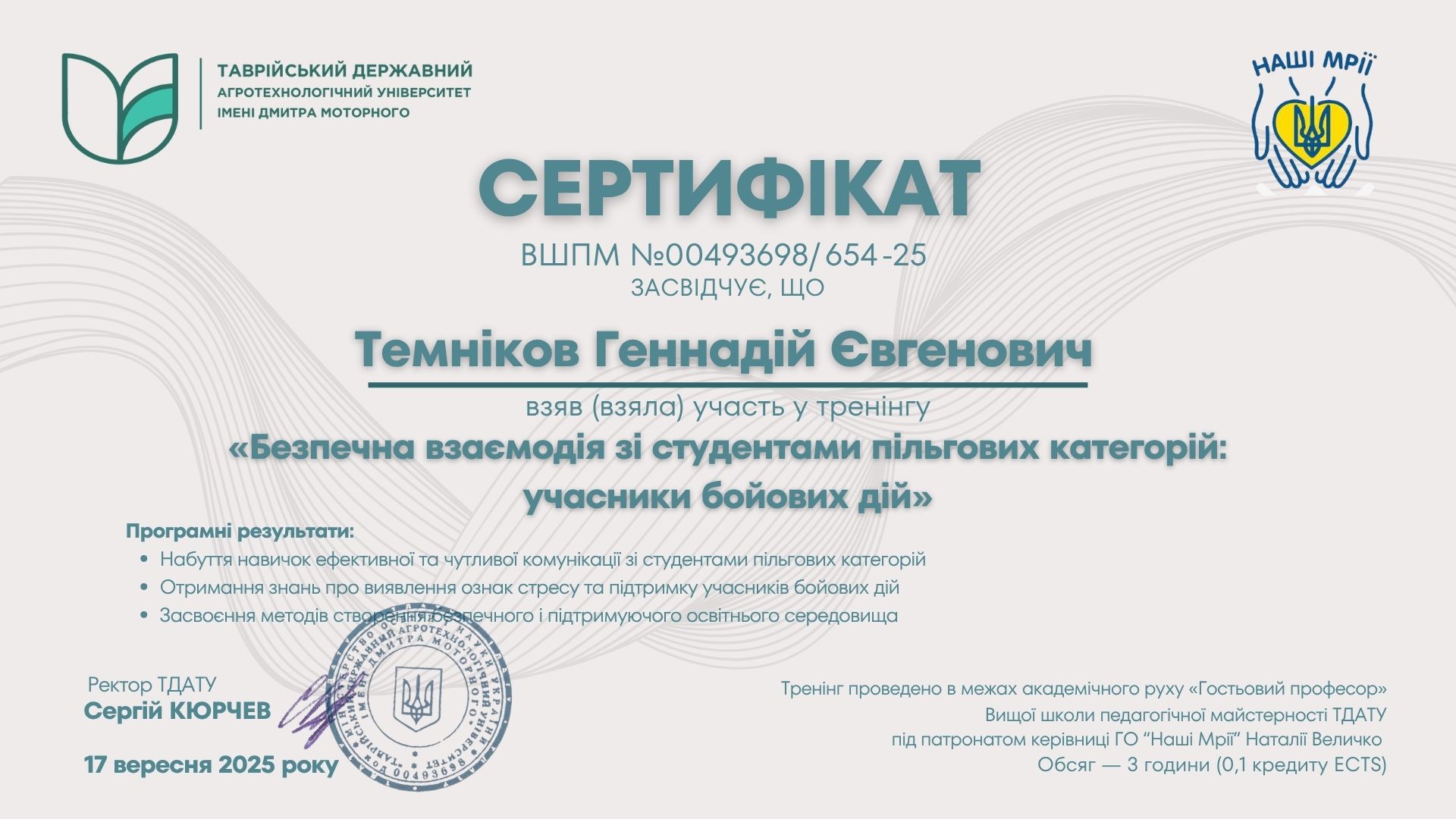 ВШПМ. Таврійський державний агротехнологічний університет імені Дмитра Моторного (м. Запоріжжя, Україна), ГО “Наші Мрії” (м.Запоріжжя, Україна). Сертифікат про підвищення кваліфікації ВШПМ №00493698/0654-25 від 17.09.2025 р. Тема: “Безпечна взаємодія зі студентами пільгових категорій: учасники бойових дій”, обсягом 3 години (0,1 кредиту ЄКТС).