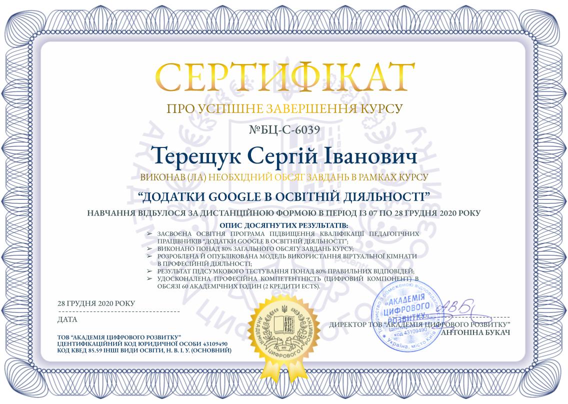 ТОВ «Академія цифрового розвитку» (м.Київ, Україна). Сертифікат про завершення курсу №БЦ-С-6039 від 28.12.2020 р. Тема: «Додатки Google в освітній діяльності», обсягом 60 годин (2 кредити ЄКТС).