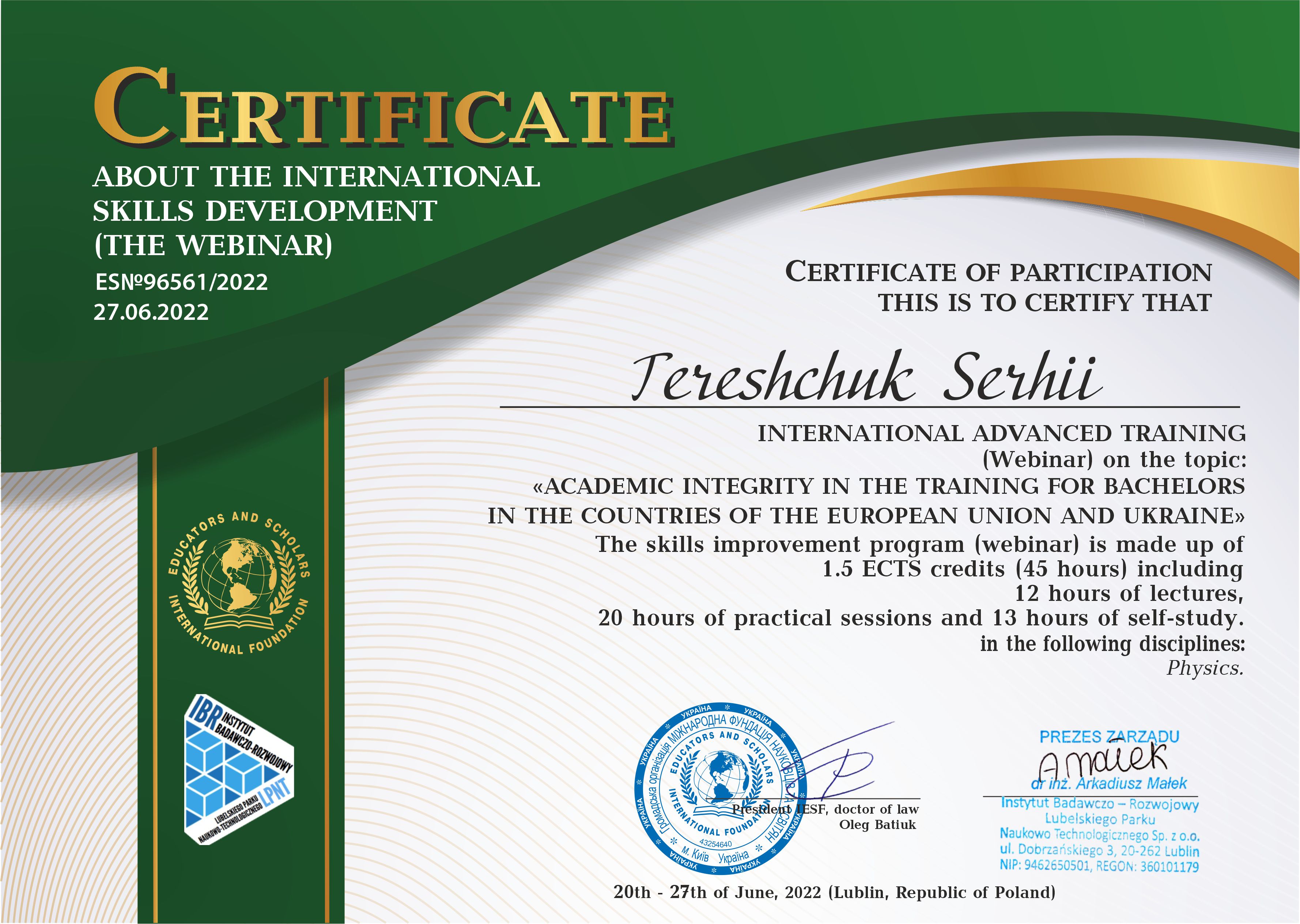 ГО «МФНО »(IESF), Instytut Badawczo-Rozwojowy Lubelskiego Parku Naukowo-Technologicznego (м. Люблін, Республіка Польща). Сертифікат про участь у вебінарі ES№ 96561/2022 від 27.06.2022 р. Тема: «Академічна доброчесність у підготовці бакалаврів в країнах Європейського Союзу та України», обсягом 45 годин (1,5 кредити ЄКТС).