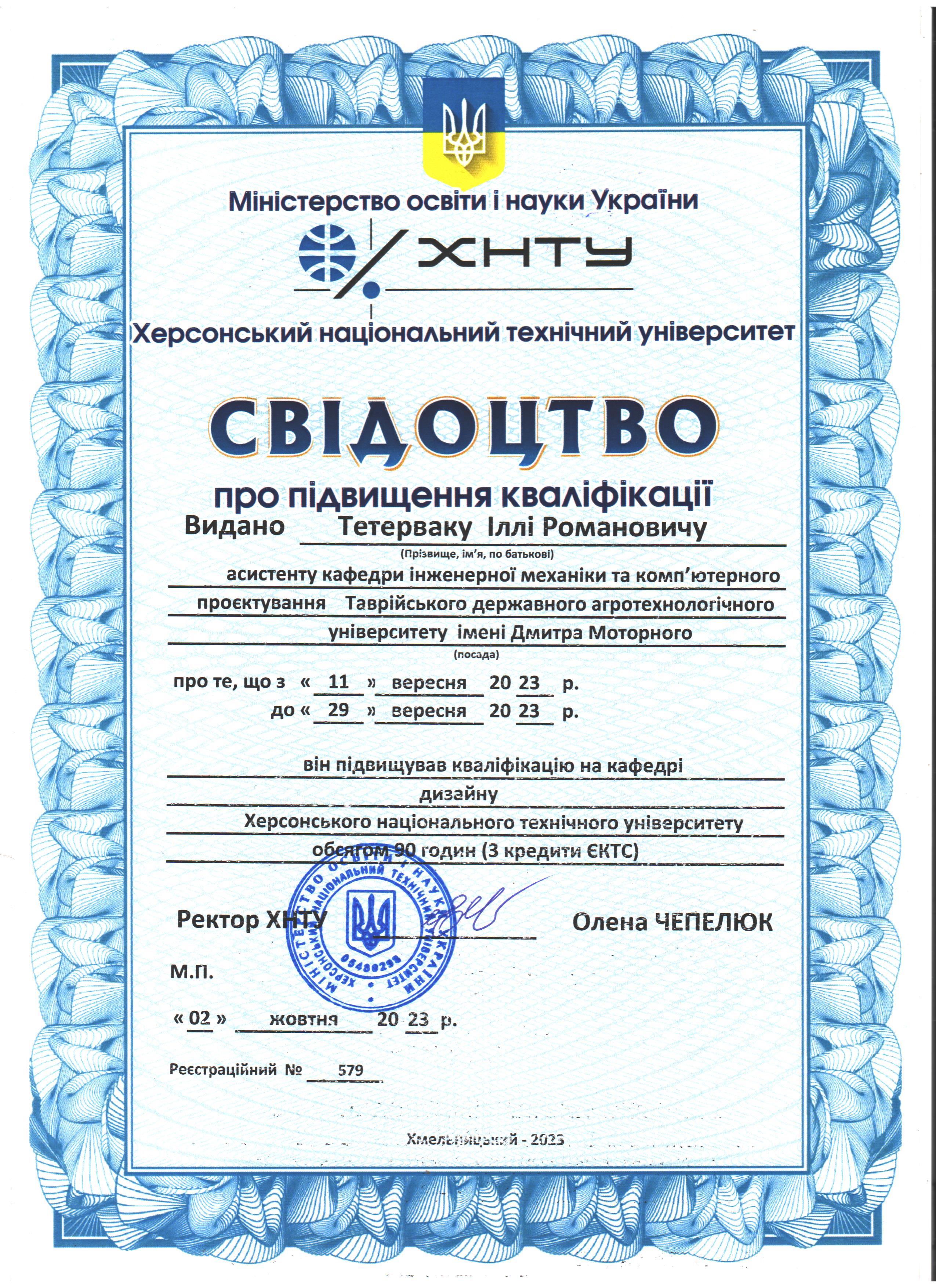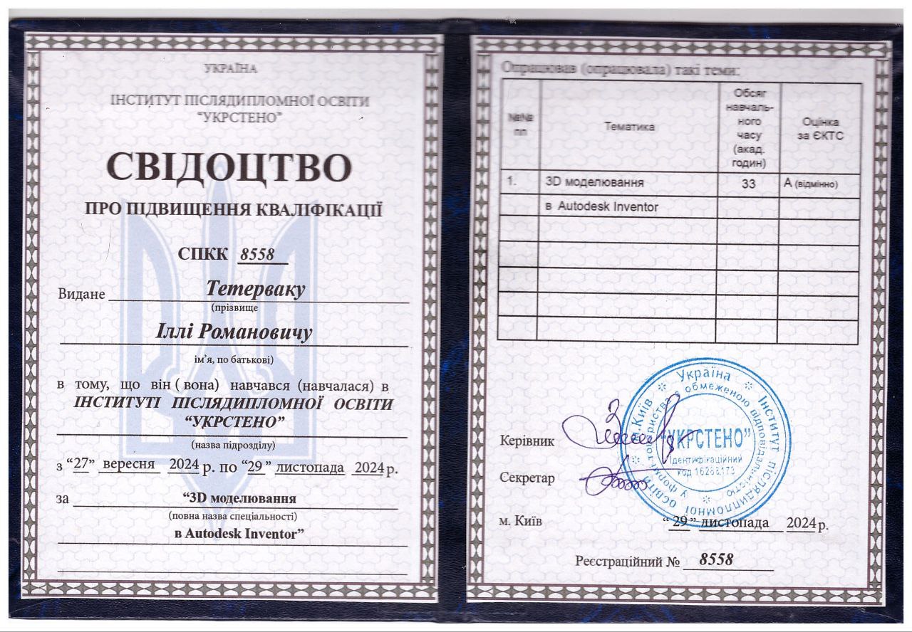 Інститут післядипломної освіти «УКРСТЕНО» (м.Київ, Україна). Свідоцтво про підвищення кваліфікації №СПКК 8558 від 29.11.2024 р. Тема: «3D моделювання в Autodesk Inventor», обсягом 33 години (1,1 кредиту ЄКТС).