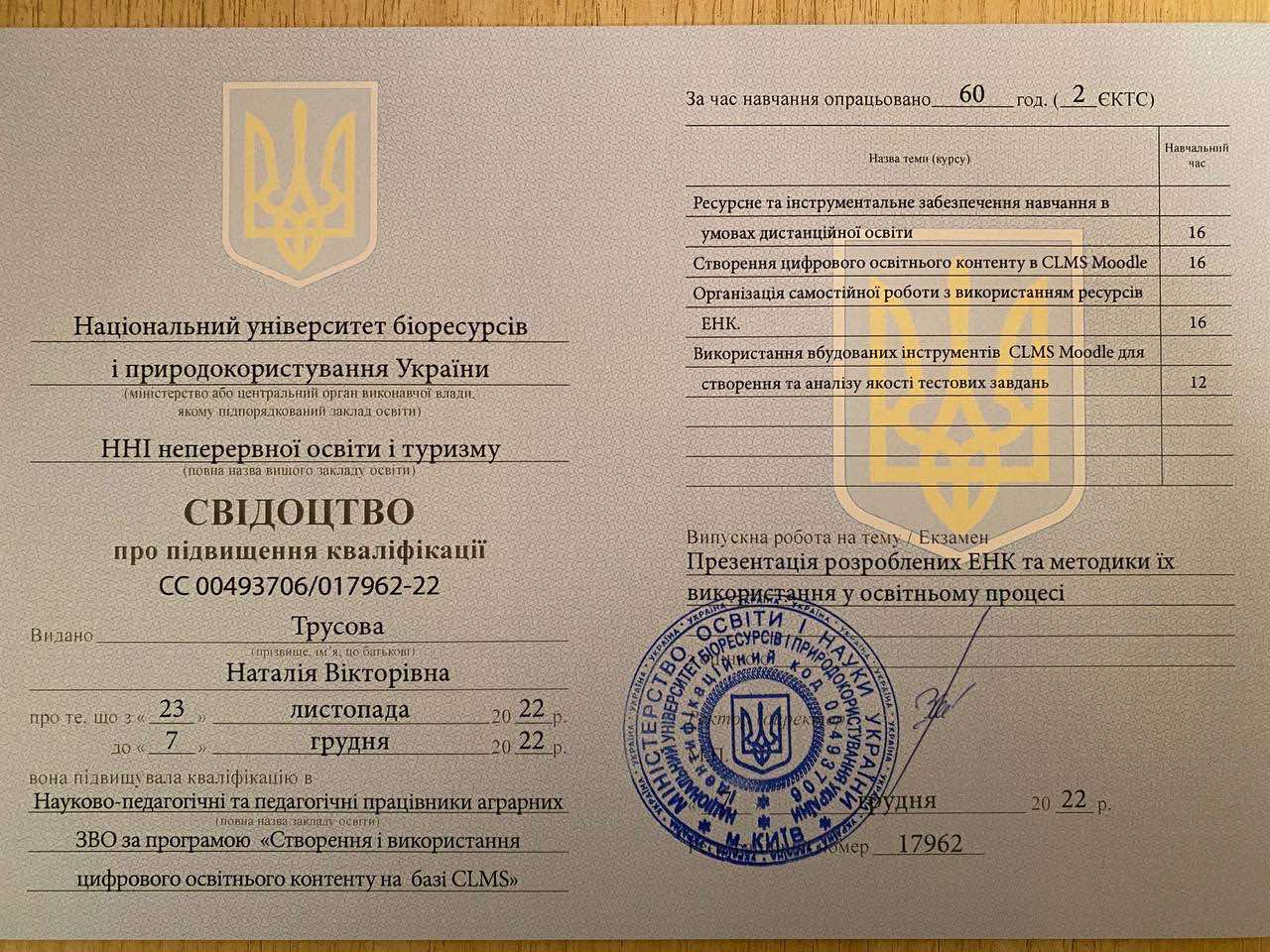 Національний університет біоресурсів і природокористування України ННІ післядипломної освіти, 2017 СС 00493706/002437-17 «Інноваційна спрямованість педагогічної діяльності»