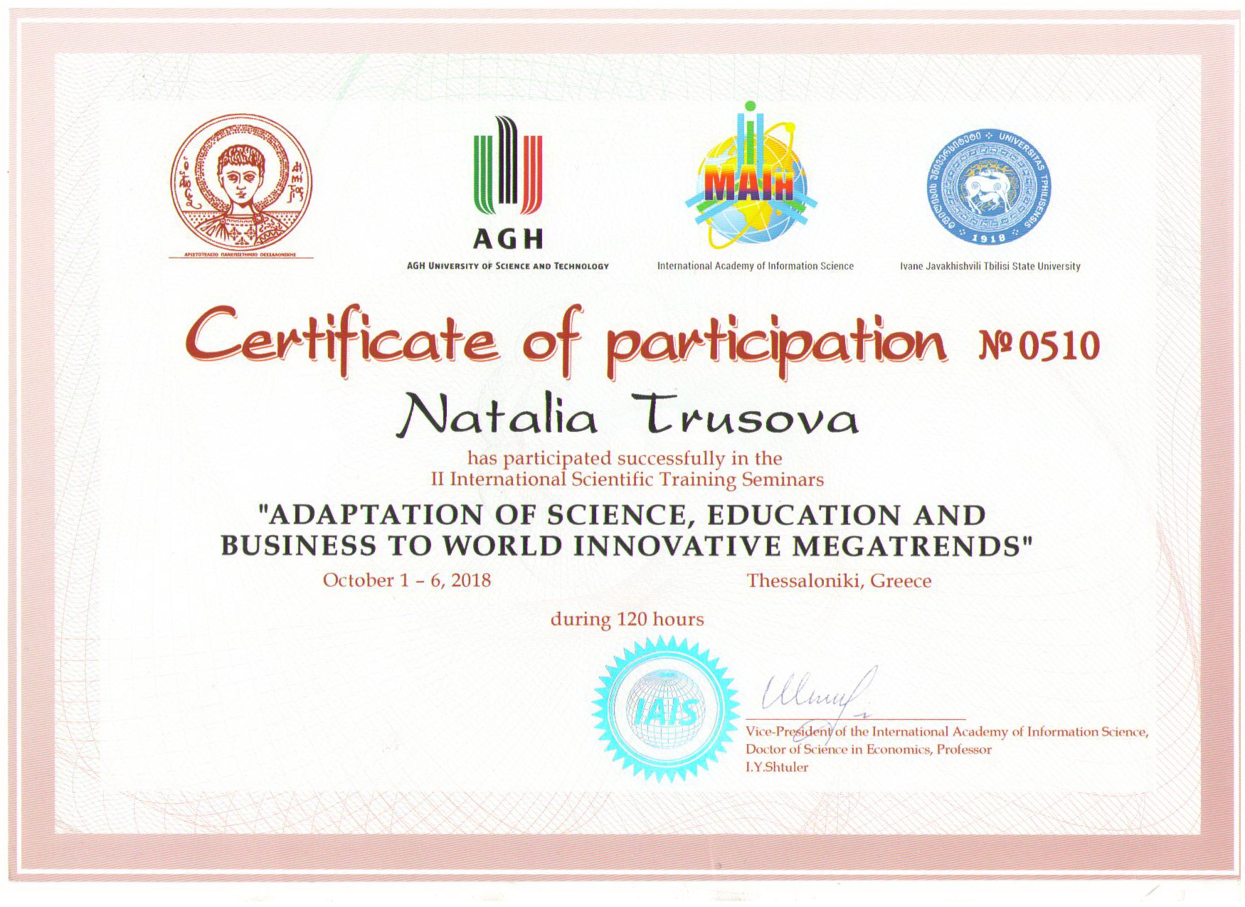 Participated in the traineeship in the program for qualification for the professors of higher educational establishments entitled “Publishing and project activity in the European Union countries” Prague Institute for Qualification Enhancement, 2016 Certificate of attendance № 112016076