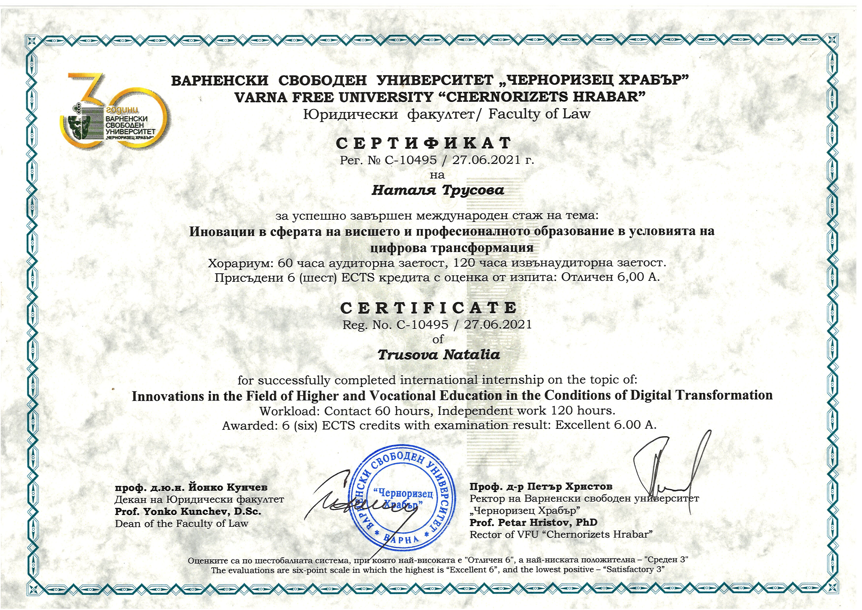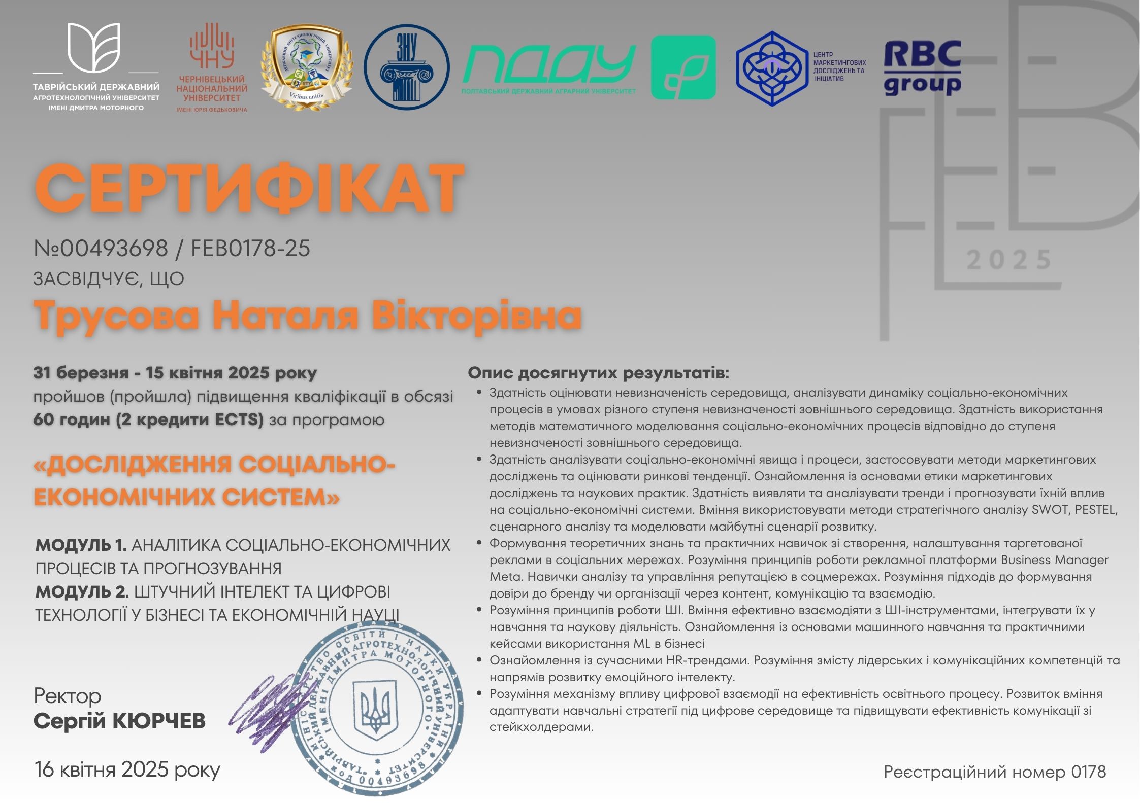 Міжнародне стажування. Baltic Research Institute of Transformation Economic Area Problems (м. Рига, Латвія). Сертифікат про науково-педагогічне стажування № С 20250397 від 16.03.2025 р. Тема: «Інноваційні освітні технології: європейський досвід та його впровадження в підготовку фахівців з економіки та управління». Тривалість – з 03.02.2025 по 16.03.2025 р., обсягом 180 годин (6 кредитів ЄКТС). Визнано підвищенням кваліфікації (наказ ректора № 243-ІПК від 30.06.2025 р.)
