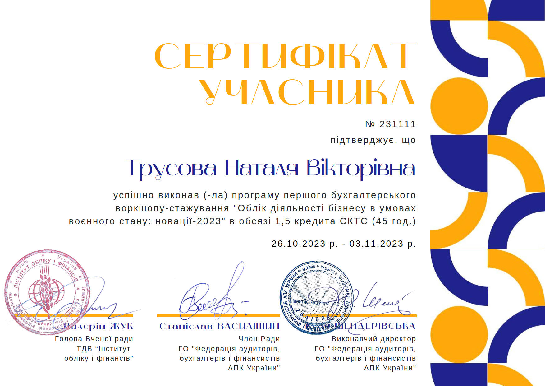 ГО “Федерація аудиторів, бухгалтерів і фінансистів АПК України”. Сертифікат №231111 від 03.11.2023 р. про завершення програми першого бухгалтерського воркшоп-стажування.Тема: “Облік діяльності бізнесу в умовах воєнного стану: новації-2023”, тривалість з 26.10.2023 р. до 03.11.2023 р., обсягом 45 год. (1,5 кредити ЄКТС). Визнано підвищенням кваліфікації (наказ №449-ІПК від 28.12.2023 р.)