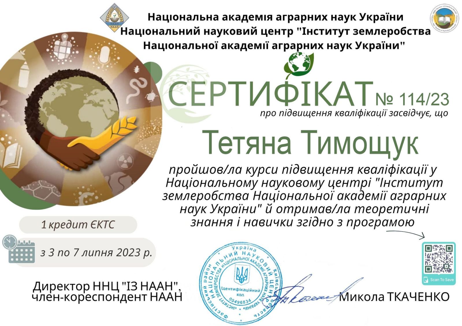 ННЦ «Інститут землеробства НААН України». (м.Київ, Україна). Сертифікат про підвищення кваліфікації № 114/23 від 07.07.2023 р., обсягом 30 годин (1 кредит ЕКТС)