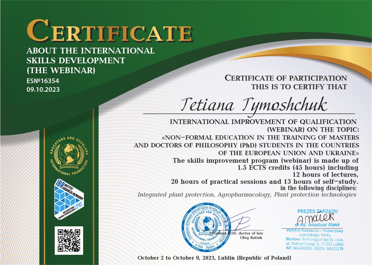 ГО “МФНО” (IESF), Instytut Badawczo-Rozwojowy Lubelskiego Parku Naukowo-Technologicznego (м. Люблін, Республіка Польща). Сертифікат про участь у вебінарі EP№ 16379 від 09.10.2023 р. Тема “Неформальна освіта в підготовці магістрів та здобувачів доктора філософії (PhD) в країнах Європейського союзу та України”, обсягом 45 годин (1,5 кредиту ЄКТС). Визнано підвищенням кваліфікації (наказ №449-ІПК від 28.12.2023 р.)