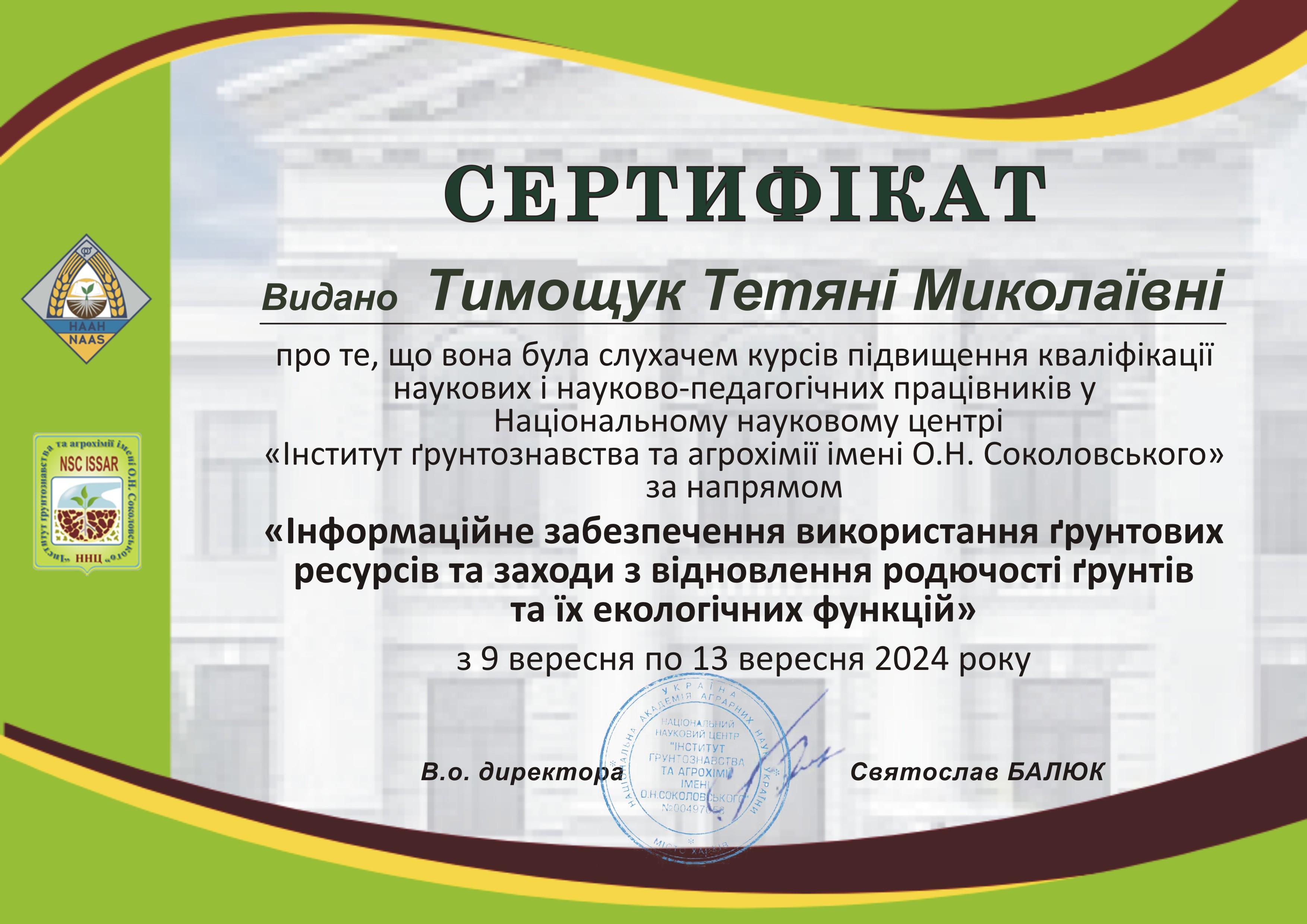 Національний науковий центр «Інститут ґрунтознавства та агрохімії імені О.Н. Соколовського» (м.Харків, Україна). Сертифікат про підвищення кваліфікації, виданий 13.09.2024 р. Тема: «Інформаційне забезпечення використання ґрунтових ресурсів та заходи з відновлення родючості ґрунтів та їх екологічних функцій», обсягом (1 кредит ЄКТС).