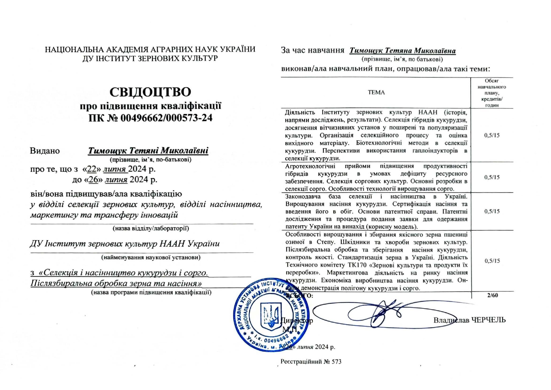 Інститут зернових культур НААН України (м.Дніпро, Україна). Сертифікат про підвищення кваліфікації ПК №00496662/000573-24 від 26.07.2024 р. Тема: «Селекція і насінництво кукурудзи і сорго. післязбиральна обробка зерна та насіння», обсягом 60 годин (2 кредити ЄКТС).