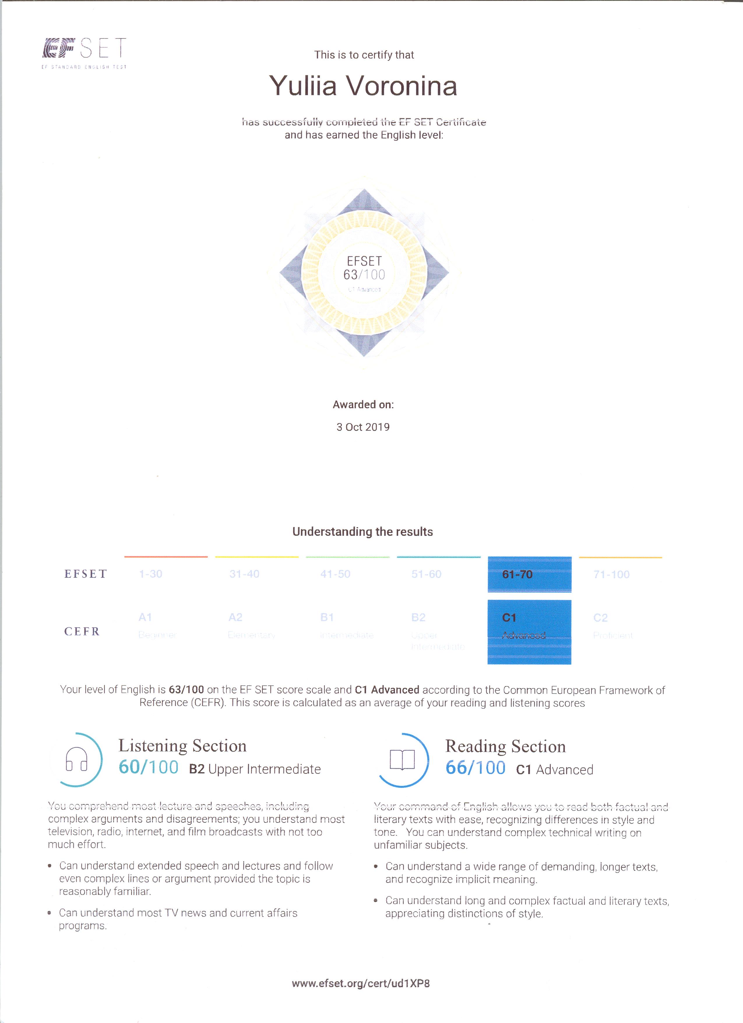 Міністерство цифрової трансформації України. Електронний сертифікат від 04.12.2020 р.про проходження тестування на тему “Рівень цифровой грамотності”