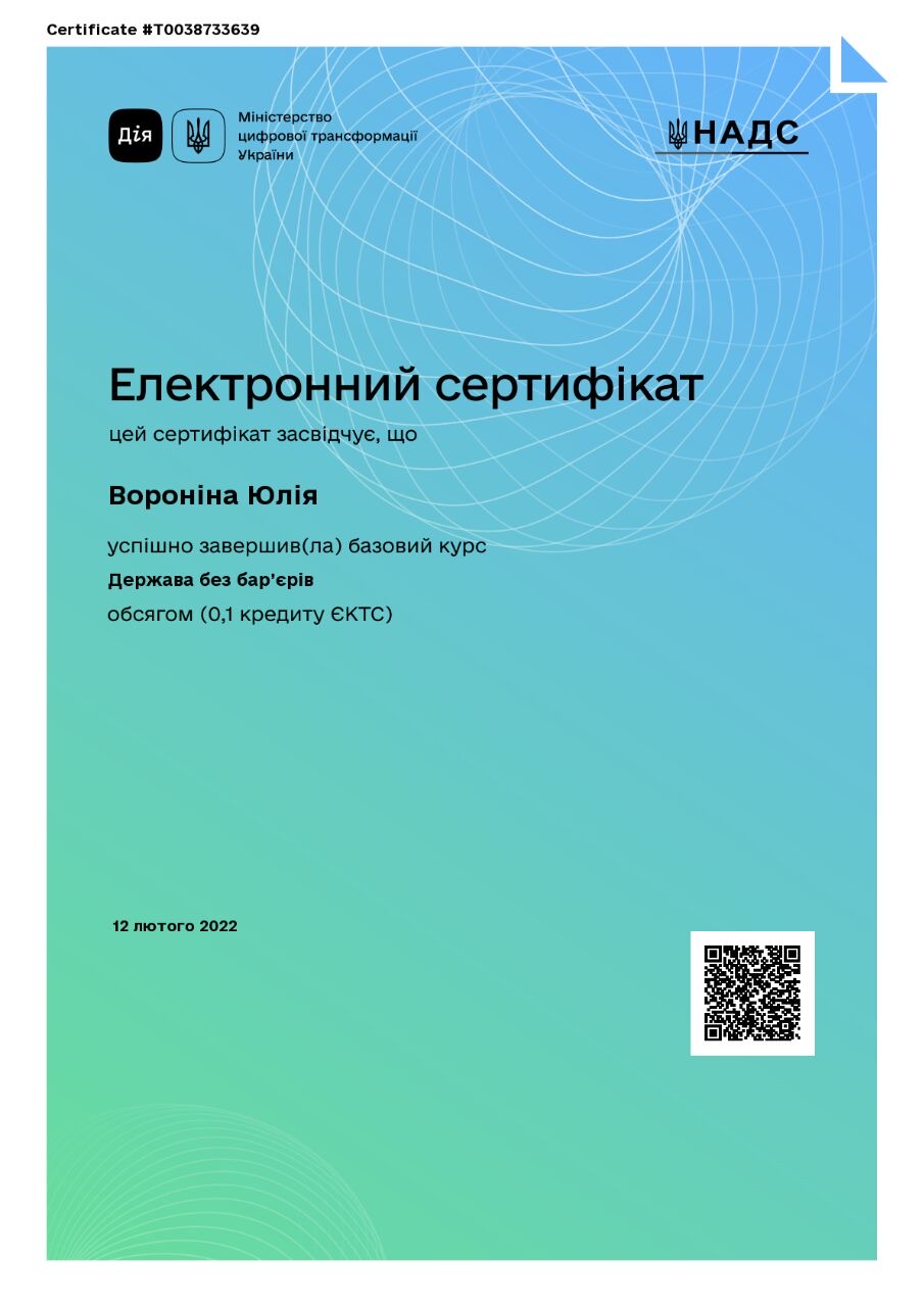 Міністерство цифрової трансформації. Сертифікат №0038733639 від 12.02.2022 р. Тема: “Держава без бар’єрів”, обсягом 0,1 кредиту ЄКТС