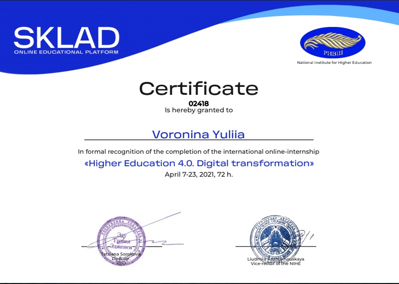 Міжнародне стажування. National Institute for Higher Education (Lucknow, Uttar Pradesh, Іndia). Сертифікат про міжнародне стажування №02418 від 23.04.2021 р. Тема: “Вища освіта 4.0. Цифрова трансформація”, обсягом 72 години (2,6 кредити ЄКТС)