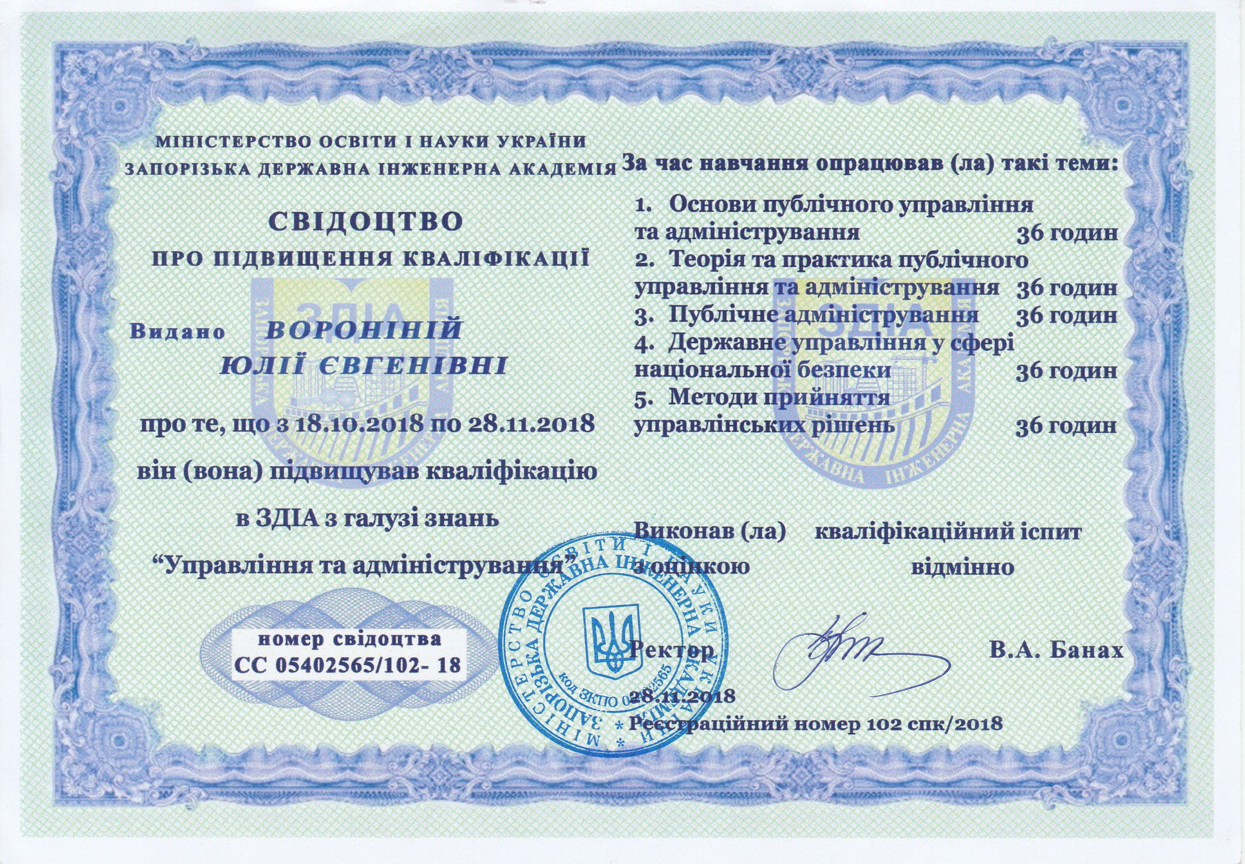 Міжнародне стажування. Instytut Spraw Administracji Publicznej (ISAP) (Lublin, Польща). Сертифікат про міжнародне стажування PL №013-05-24 від 10.05.2024 р. Тема: «Досвід державного управління та адміністрування ЄС», обсягом 180 годин (6 кредитів ЄКТС).Визнано підвищенням кваліфікації (наказ ректора ТДАТУ №104-ІПК від 31.05.2024 р.)