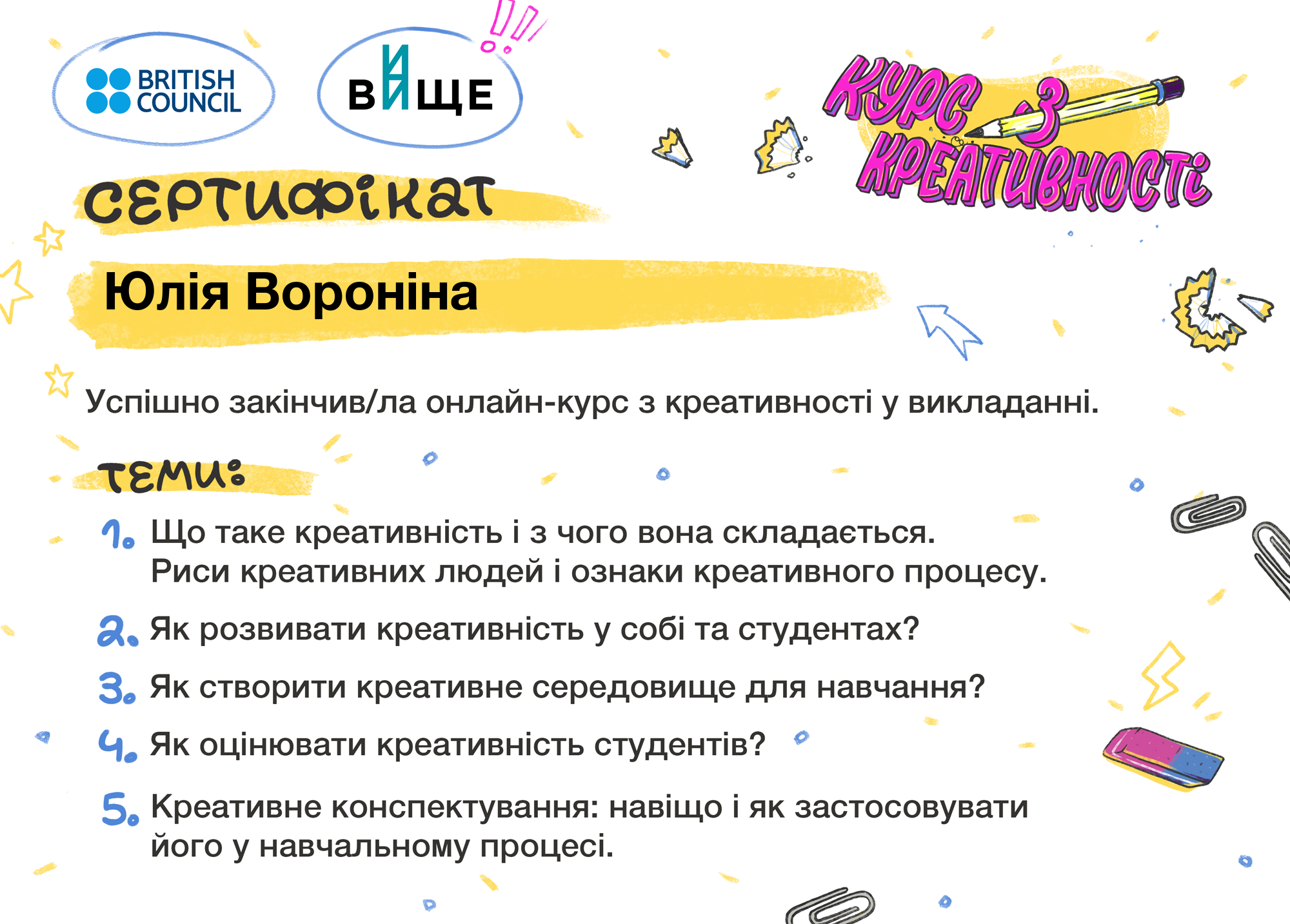 British Council, ГО “Вище”. Сертифікат про завершення курсу з креативності у викладанні від 20.06.2020 р.