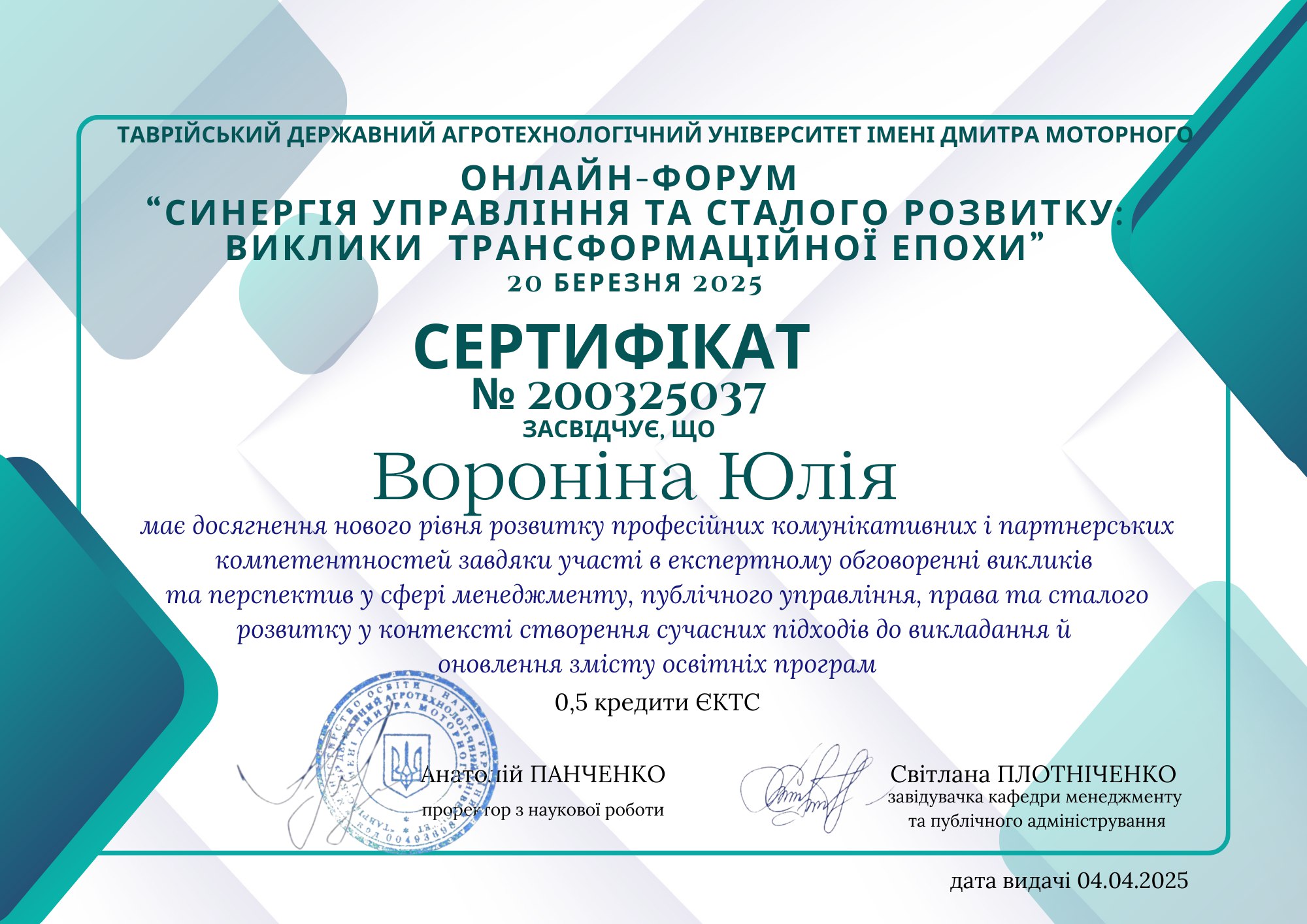 Таврійський державний агротехнологічний університет імені Дмитра Моторного (м. Запоріжжя, Україна). Сертифікат про участь в онлайн-форумі №200325037 від 04.04.2025 р. Тема: “Синергія управління та сталого розвитку: виклики трасформаційної епохи”, обсягом 0,5 кредиту ЄКТС.