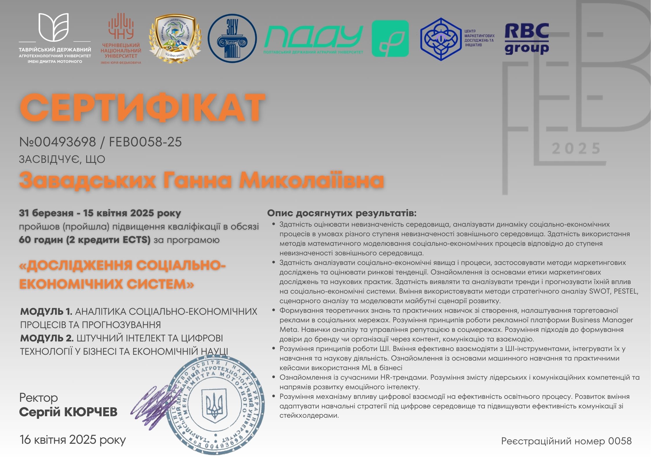 ТДАТУ (м. Запоріжжя, Україна), ЧНУ (м. Чернівці, Україна), ДБТУ (м. Харків, Україна), ЗНУ (м. Запоріжжя, Україна), ПДАУ (м. Полтава, Україна), ЦМДІ, RBC group (м. Київ, Україна). Сертифікат про підвищення кваліфікації №00493698 / FEB0058-25 від 16.04.2025 р. Тема: “Дослідження соціально-економічних систем”, обсягом 60 годин (2 кредити ЄКТС).