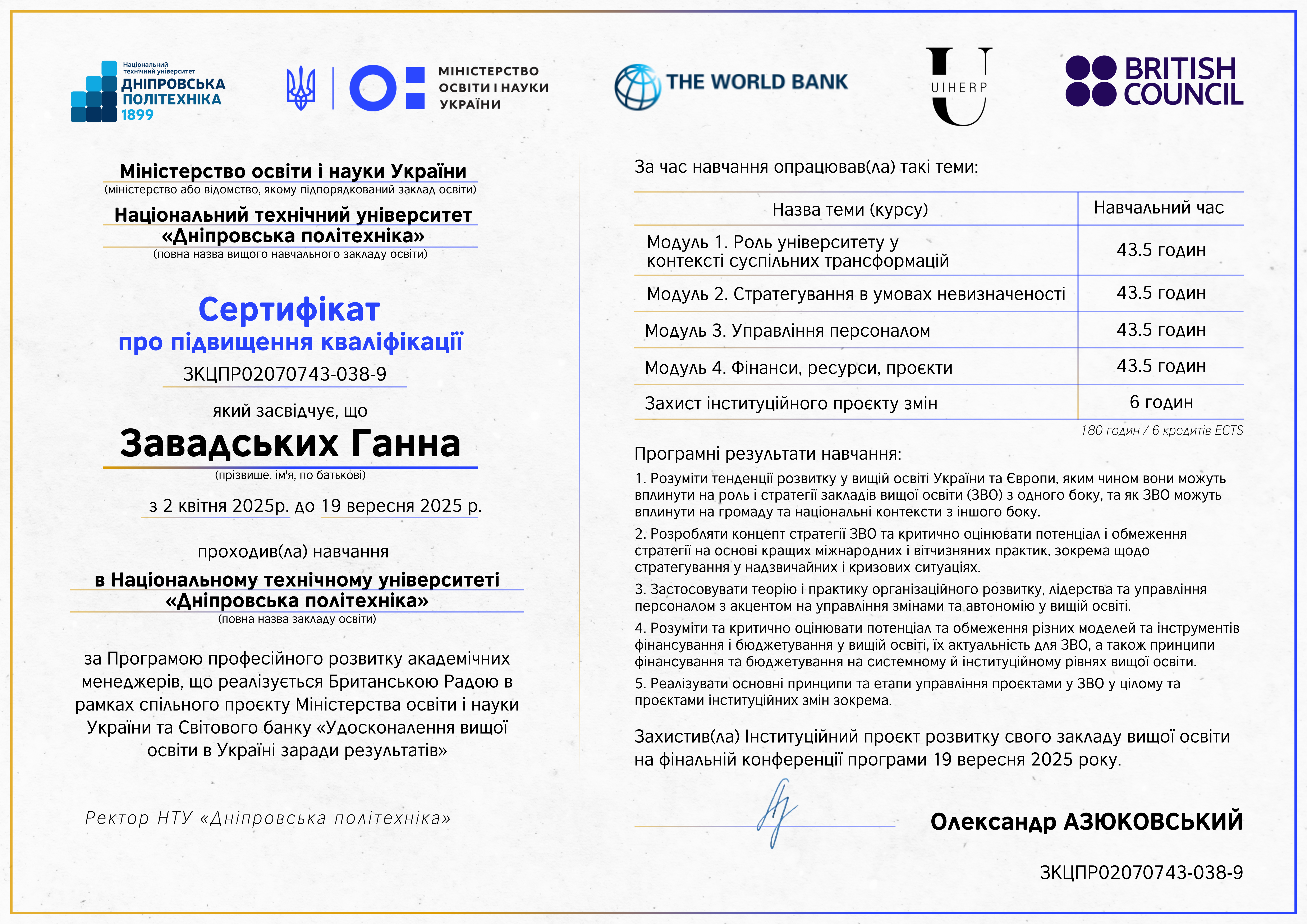 НТУ “Дніпровська політехніка”. Сертифікат про підвищення кваліфікації №ЗКЦПР02070743-038-9 від 19.09.2025 р. Тема: “Програма професійного розвитку академічних менеджерів” (реалізується Британською Радою в рамках спільного проєкту МОН України та Світового банку “Удосконалення вищої освіти в Україні заради результатів”), обсягом 180 годин (6 кредитів ЄКТС).