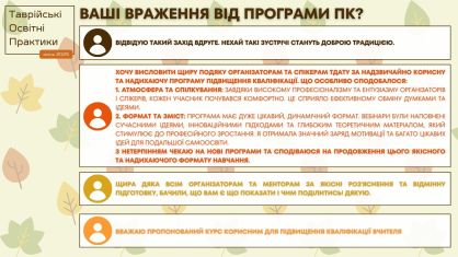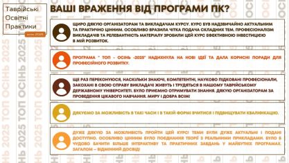 За відгуками учасників, «ТОП-Осінь-2025» стала джерелом нових ідей і практичних порад для професійного розвитку, надала актуальні знання і впевненість у власних силах. Вони відзначили високий рівень професіоналізму викладачів, комфортну атмосферу навчання та цінність поєднання теорії з практичними прикладами. Програма надихнула на творчі педагогічні рішення, що сприятимуть якісним змінам в освітньому середовищі ТДАТУ. Учасники з нетерпінням очікують нових зустрічей і майбутніх проєктів, які зміцнюватимуть спільноту та сприятимуть впровадженню інноваційних підходів у навчанні.