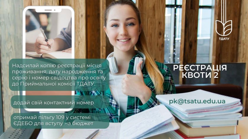 Як вступити до ТДАТУ за квотою-2 8.08.2022 Увага, вступнику по квоті-2 ! Надсилай копію реєстрації місця проживання, дату народження та серію і номер свідоцтва про освіту до Приймальної комісії ТДАТУ pk@tsatu.edu.ua так ти отримаєш пільгу 109 у системі ЄДЕБО для вступу на бюджет. Не забудь додати свій контактний номер.