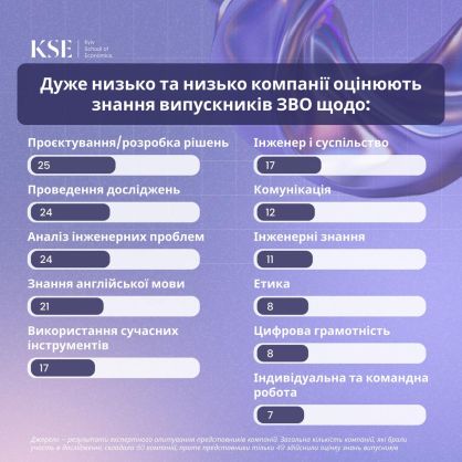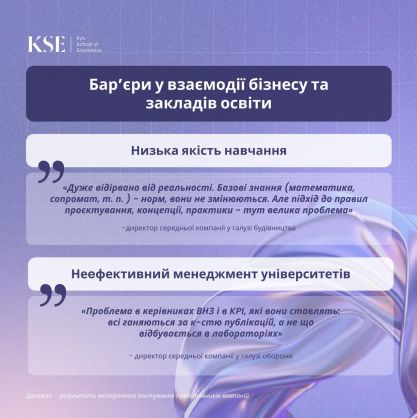 🔹 Компанії зацікавлені у співпраці з університетами через стажування, спільну розробку освітніх програм та гостьові лекції. Основний бар’єр — якість освіти та бюрократія.