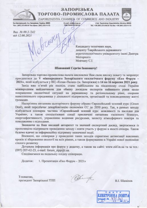 Вже не перший рік науковці Таврійського державного екологічного університету імені Дмитра Моторного беруть участь у Запорізькому міжнародному екологічному форумі «ЕКОФОРУМ-2021», який відбувається під патронатом Запорізької торгово-промислової палати.
