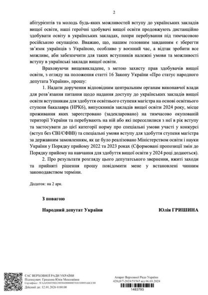 За ініціативи Юлії Гришиної було подане звернення щодо спрощення умов вступу на магістратуру для абітурієнтів з тимчасово окупованих територій Прем’єр-міністру Денису Шмигалю та міністру з питань реінтеграції тимчасово окупованих територій Ірині Верещук.