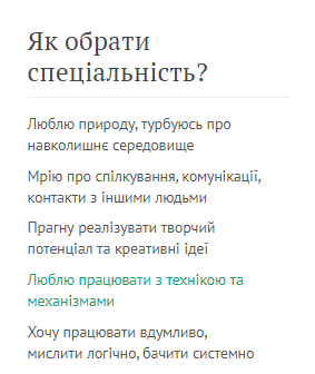 У такому випадку будуть у нагоді рекомендації кар’єрного консультанта, що допоможе краще зрозуміти ваші природні схильності та здібності до опанування тієї чи іншої професії. Для отримання консультації необхідно пройти онлайн-тестування, за результатами якого ви зможете отримати поради щодо вибору професії на основі природних здібностей та інтересів. Отримані результати онлайн-тестування допоможуть кар’єрному консультанту підібрати для вас найкращі варіанти для навчання.