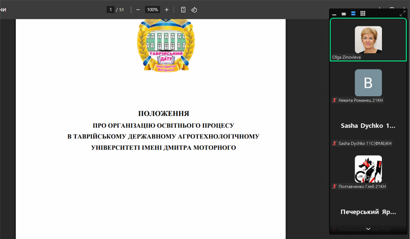 Під час зустрічі куратор старший викладач Зінов’єва О.Г. познайомила студентів з положенням «Про організацію освітнього процесу в Таврійському державному агротехнологічному університеті». Особливу увагу було приділено питанням академічної доброчесності, підсумковій атестації здобувачів.. Здобувачам також було продемонстровано, де саме на офіційному сайті університету можна знайти всі нормативні документи, які регламентують навчальний процес. Це допоможе студентам краще орієнтуватися в освітньому середовищі та сприяють ефективному засвоєнню матеріалу.
