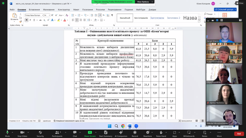 10 грудня на черговому засіданні кафедри було обговорено результати опитувань здобувачів щодо якості освітньої програми та якості освітнього процесу за освітньо-професійною програмою «Комп’ютерні науки» за 2023–2024 навчальний рік.