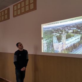 Гість заходу Дмитро розповів про своє захоплення зйомкою краєзнавчих об’єктів. Вперше «у люди» зі своїми роботами Дмитро вийшов, беручи два роки тому участь у конкурсах відеороликів «Саме тут …» та фотоконкурсі «235 кадрів», де його роботи посіли перші місця. Також Дмитро розповів про історичні та культурні пам’ятки міст та сіл Запорізького краю.