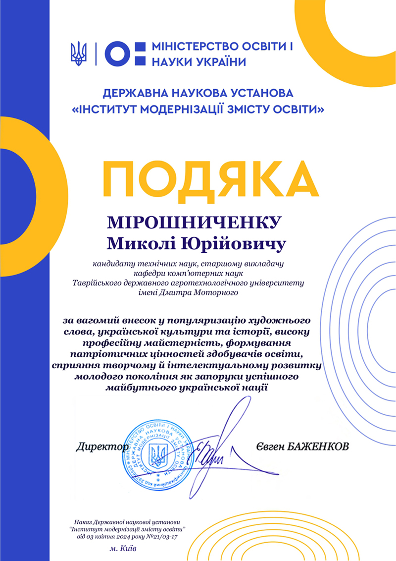 Подяка ДНУ «Інститут модернізації змісту освіти» (наказ №21/03-17 від 03.04.24)