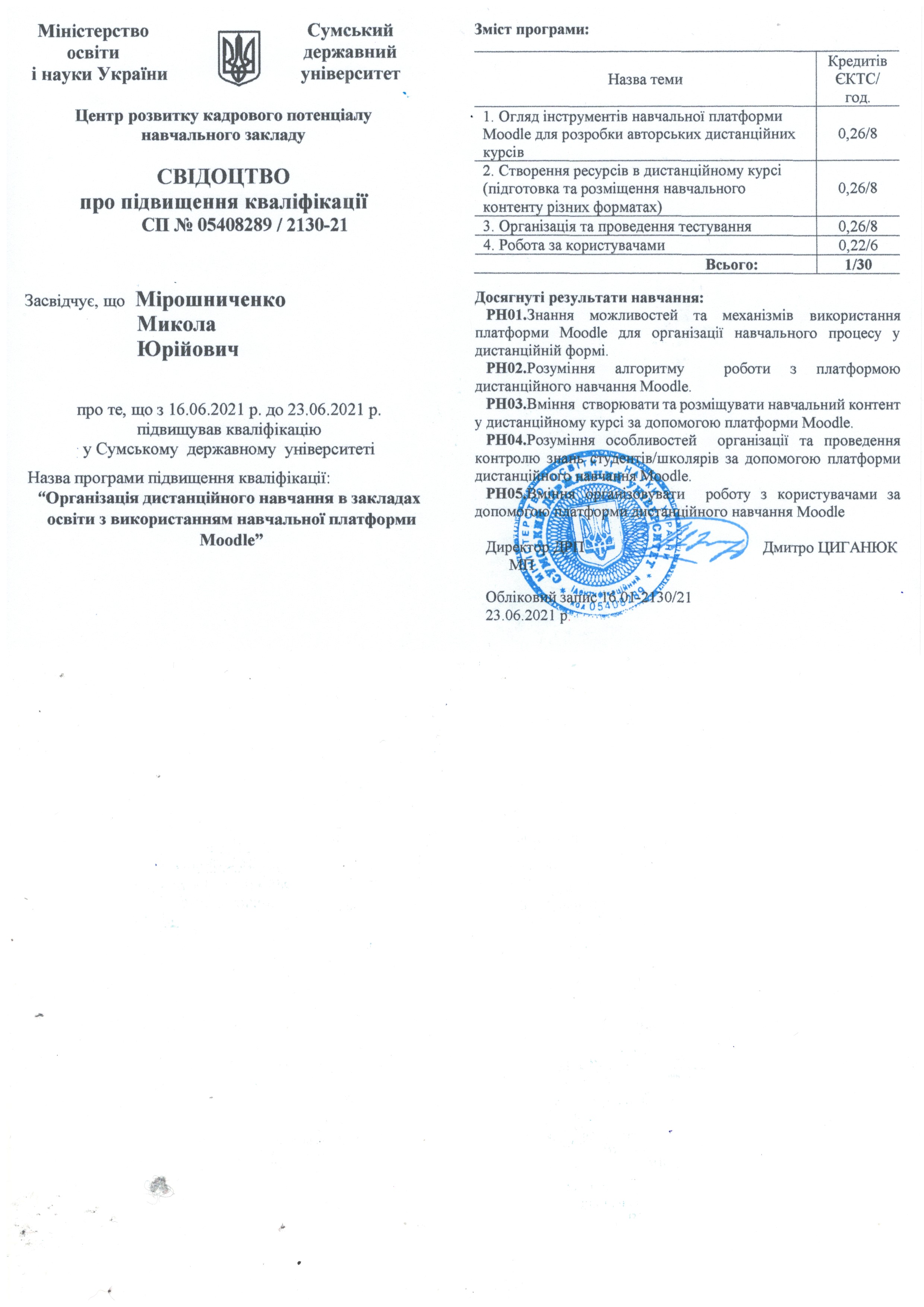 - Сертифікат про підвищення кваліфікації за освітньою програмою "Інформаційно-цифровий простір: відкрита освіта", ТДАТУ, 15 год., 2023 рік.